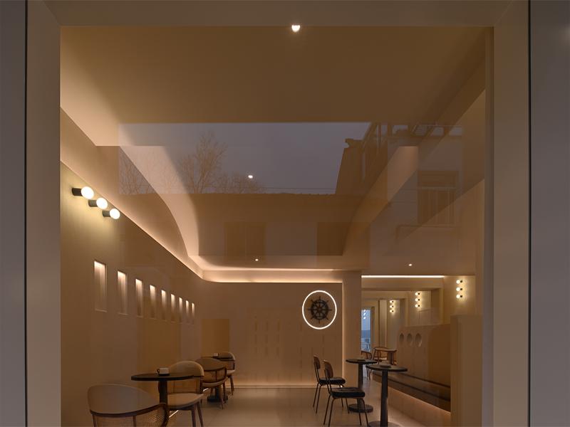 公共区域同样延续了整体美学逻辑:楼梯间以玻璃护栏搭配踏步灯,兼顾安全与现代感;休闲区的船舵装饰暗合临水主题,暖调灯光与简约桌椅,为住客提供了社交与休憩的舒适场景。