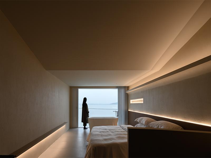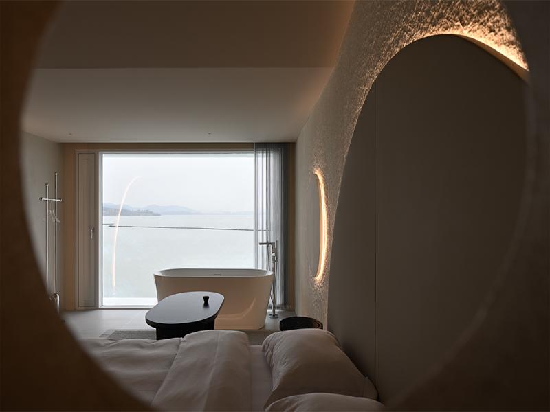 这套设计的核心,是让自然成为空间的主角。每间客房都配置了超大面宽落地窗,将澄澈湖面与层叠远山完整引入室内,实现 “躺在床上看湖” 的沉浸式体验。窗边独立浴缸的设置,让沐浴也成为与自然对话的仪式感场景,清晨看雾霭漫过水面,夜晚枕着星光与湖风入眠,每一刻都充满治愈感。