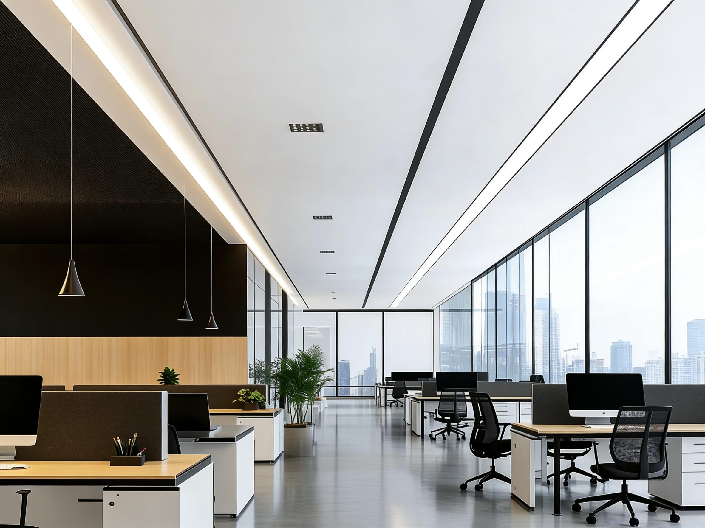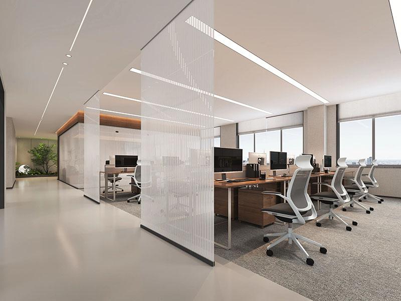 大面积落地玻璃幕墙是空间的一大亮点,不仅引入充足自然采光,还将成都城市景观融入办公场景,让员工在工作中随时感受城市活力。人工照明采用无主灯设计,以线性灯带为主光源,搭配局部吊灯与筒灯,打造层次丰富的照明系统,既满足办公的亮度需求,又营造出舒适柔和的光环境,避免强光直射造成的视觉疲劳。