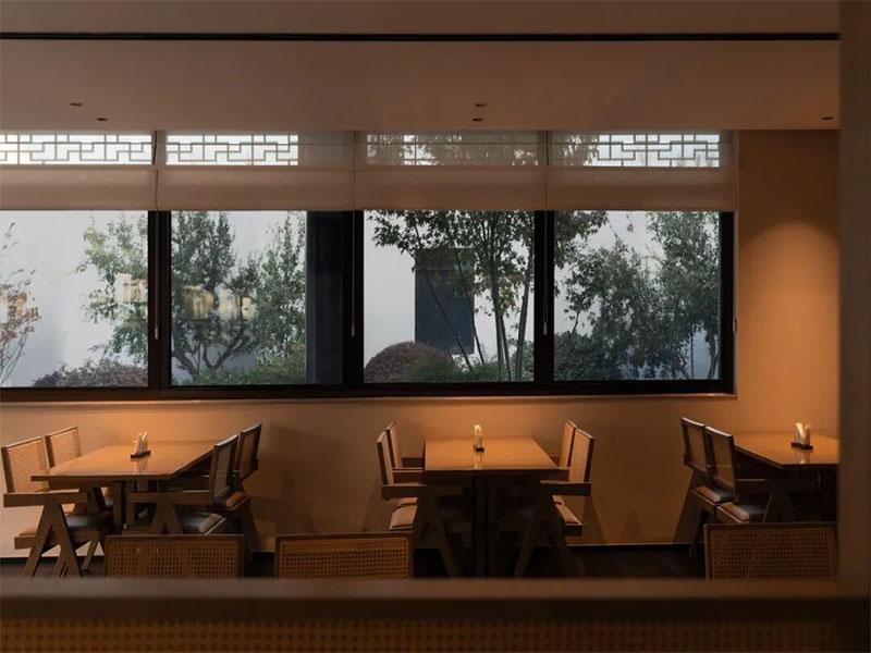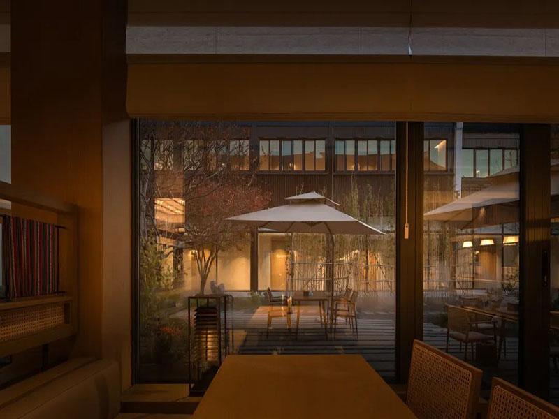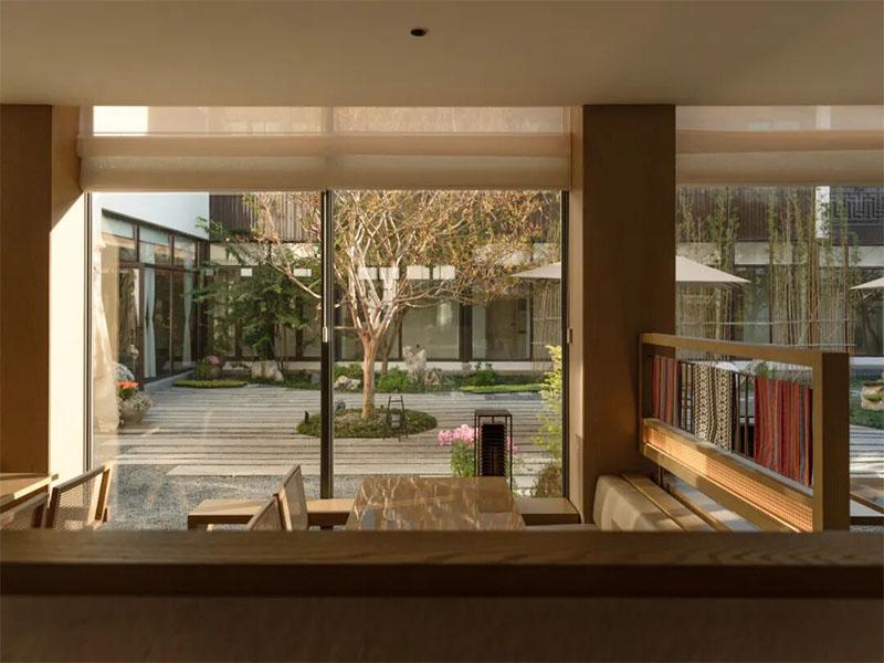 步入酒店,首先映入眼帘的是通透的庭院景观。大面积落地玻璃将室外的枯山水庭院引入室内,原木色的梁柱与温润的光影交织,既保留了中式合院的围合感,又以现代手法消解了空间的压抑。庭院中孤植的树木、错落的置石与铺陈的青石板,复刻了江南园林“移步换景”的意境,让住客在室内便能沉浸式感受自然的四季流转,实现了“窗含庭院景,人在画中游”的诗意体验。