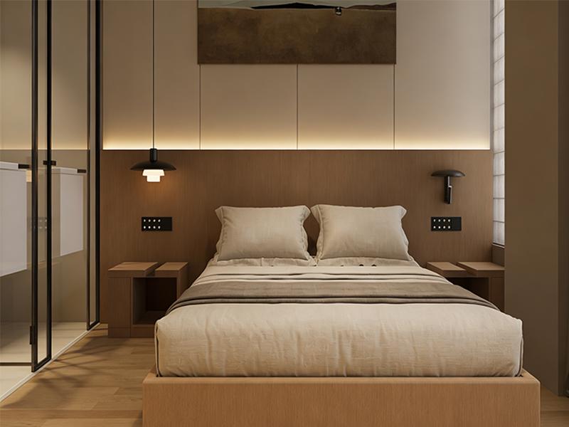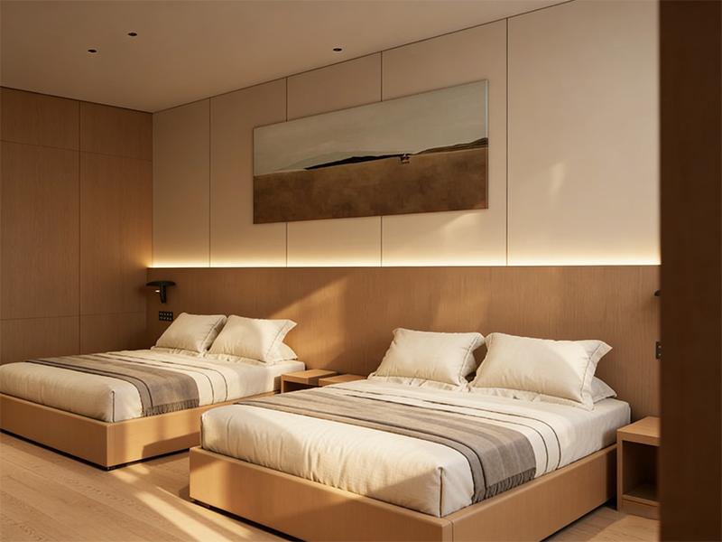 客房是 800㎡酒店装修的核心板块,规划 12-15 间不同户型,涵盖大床房、双床房与小型套房,单房面积控制在 40-50㎡,兼顾舒适度与空间利用率。客房内部延续温润的木色与浅色系搭配,地面选用耐磨防滑的实木地板,墙面采用环保抗菌乳胶漆,搭配无主灯设计,通过嵌入式筒灯与线性灯带营造 3000K 暖光氛围,契合旅客休憩需求。床头预留 USB 充电接口、智能控制面板等设施,满足商务人士办公与充电需求;独立衣帽柜与行李架的配置,让衣物与行李收纳更有序,细节处彰显人性化设计。