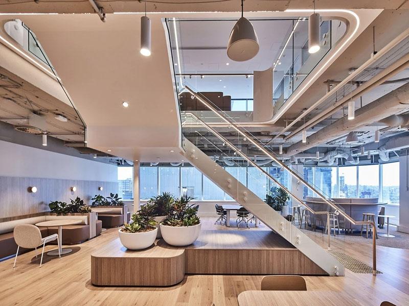 休闲社交区承载着员工休憩与企业轻社交需求,是本次办公设计的亮点所在。图 2 的双层空间以玻璃楼梯衔接上下层,上层保留开放式休闲格局,搭配简约沙发与绿植,下层设置休闲茶座与轻办公区,工业风吊顶搭配柔和灯光,营造出松弛又不失质感的休憩氛围。图 4 的茶水吧与图 5 的休闲卡座区延续自然调性,浅木色橱柜搭配简约吧椅,软包卡座与暖光壁灯点缀其间,既可为员工提供简餐、饮品补给,也能作为小型洽谈、团队放松的理想角落,有效缓解办公疲劳,提升团队凝聚力。