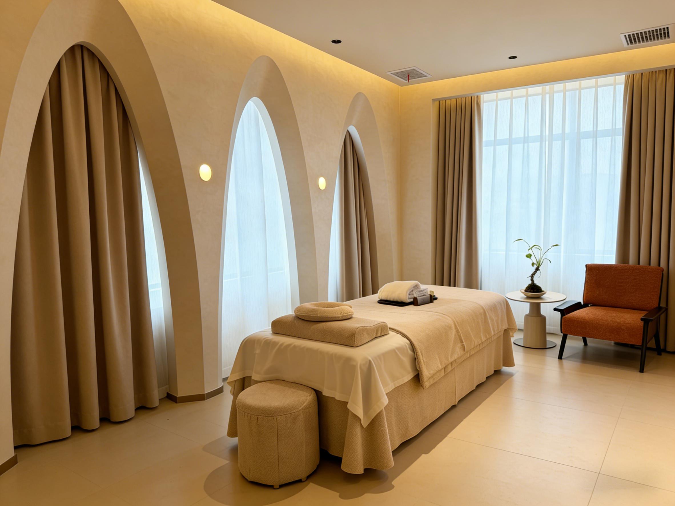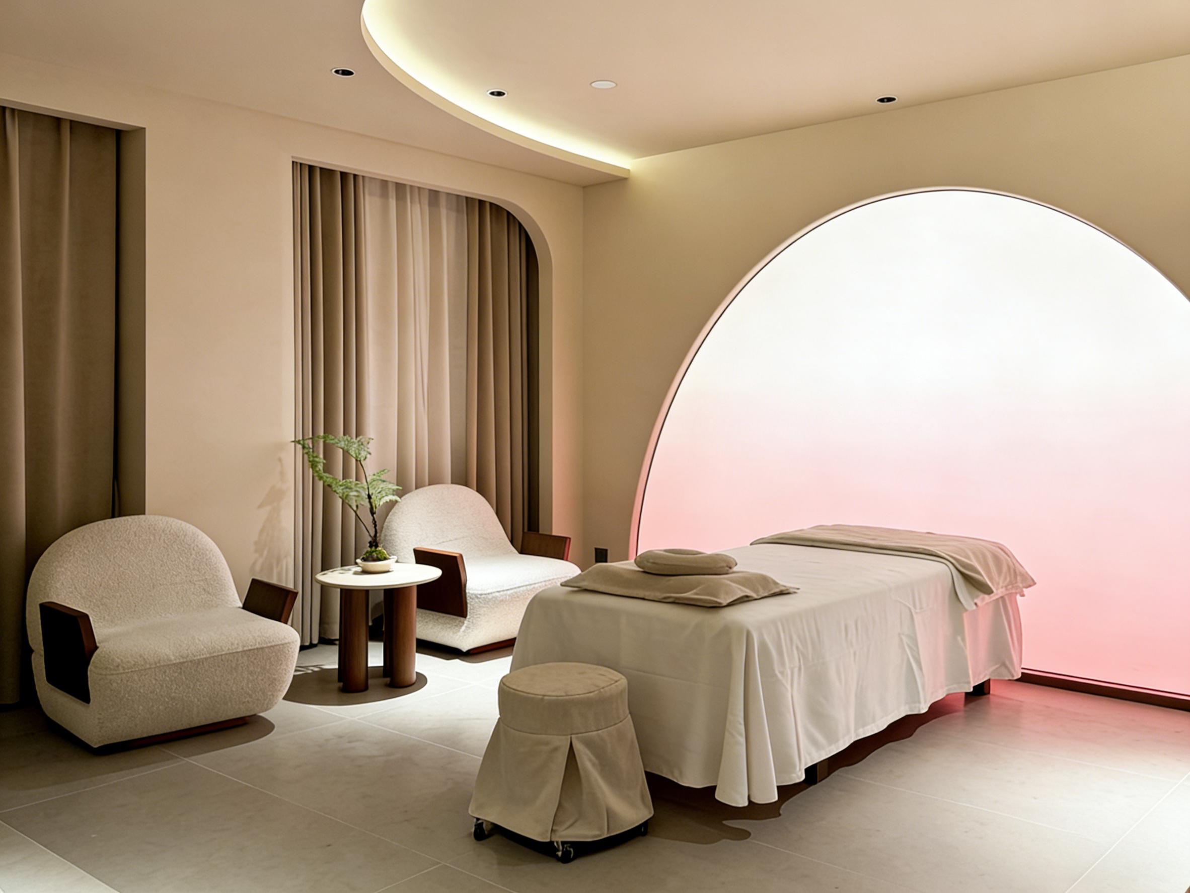 做美容院设计,他们主打舒适治愈氛围。配色多选低饱和奶白、浅咖、柔灰,拒绝艳俗花哨,靠艺术漆、微水泥、原木饰面提升细腻质感,耐看又显高级。所有软装硬装材料优先选环保无异味、易清洁耐打理的,适配美容门店高频消杀、日常维护的刚需。