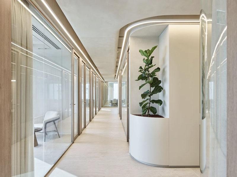 办公会议区兼顾高效协作与私密需求。开放式办公区以通透的玻璃隔断划分独立工位,既保障了采光的最大化,又实现了动静分离;弧形走廊串联起各个功能空间,搭配绿植造景,让动线流畅且充满生机。大型会议室以同色系长桌与软包座椅打造,弧形灯带与全景玻璃呼应整体设计,满足企业大型会议、商务洽谈的专业需求,同时用柔和的氛围提升沟通效率。