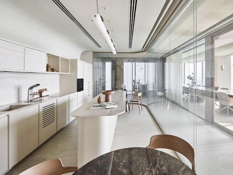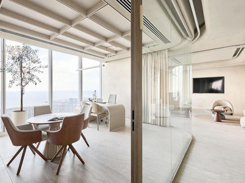 后勤水吧区则延续了整体的自然质感,浅白色橱柜搭配岛台设计,既满足员工日常饮水、简餐需求,又能作为临时轻办公、团队交流的空间,让办公生活更具烟火气。开放式的玻璃隔断让空间更显通透,与整体办公设计风格完美统一。