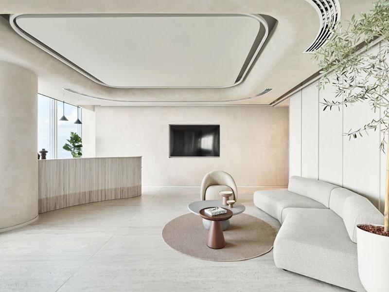 接待休闲区是企业的第一门面,也是本次办公设计的亮点。空间以温润的米白色微水泥为基底,弧形吊顶与圆角立柱弱化了空间的棱角感,搭配浅灰色模块化沙发与艺术感茶几,营造出松弛雅致的接待氛围。大面积落地窗将天府新区的城市天际线引入室内,搭配绿植造景,让自然光影贯穿整个空间,让访客在洽谈时也能感受到舒适与从容。