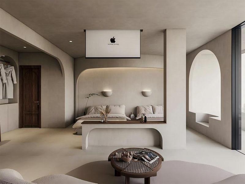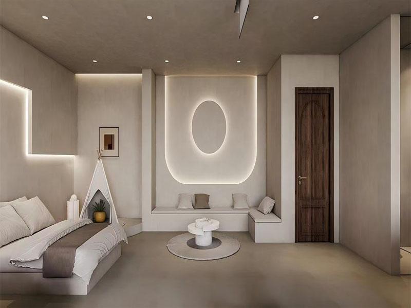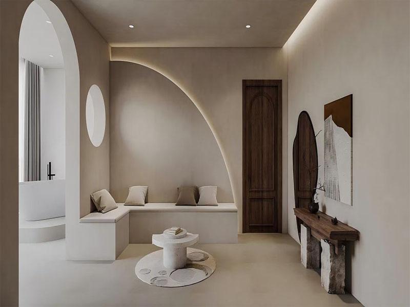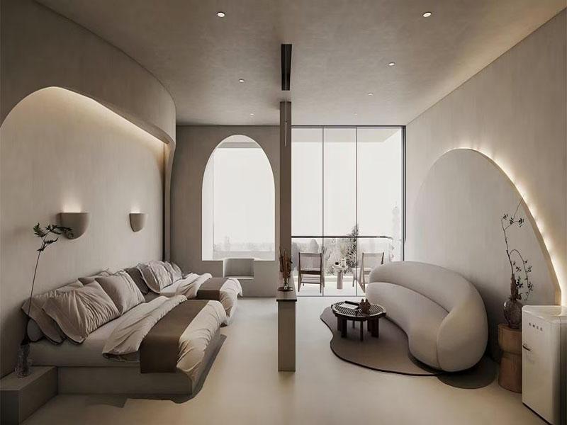 本次项目以 “侘寂风” 为设计主线,摒弃冗余装饰,回归空间本质。整体空间采用低饱和度的米灰、奶白为主色调,搭配微水泥打造的温润墙面与地面,营造出柔和、静谧的视觉氛围,让每一处角落都充满治愈感。设计团队精准把握侘寂风的核心精髓,将弧形、椭圆等柔化线条融入空间结构:无论是床头背景墙的椭圆发光造型,还是墙面的拱形门洞、弧形灯带,都以流畅线条弱化空间棱角,让整个空间更具呼吸感与流动感,同时强化了空间的层次与韵律。