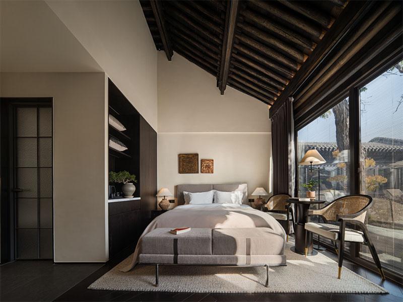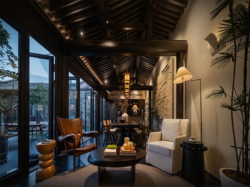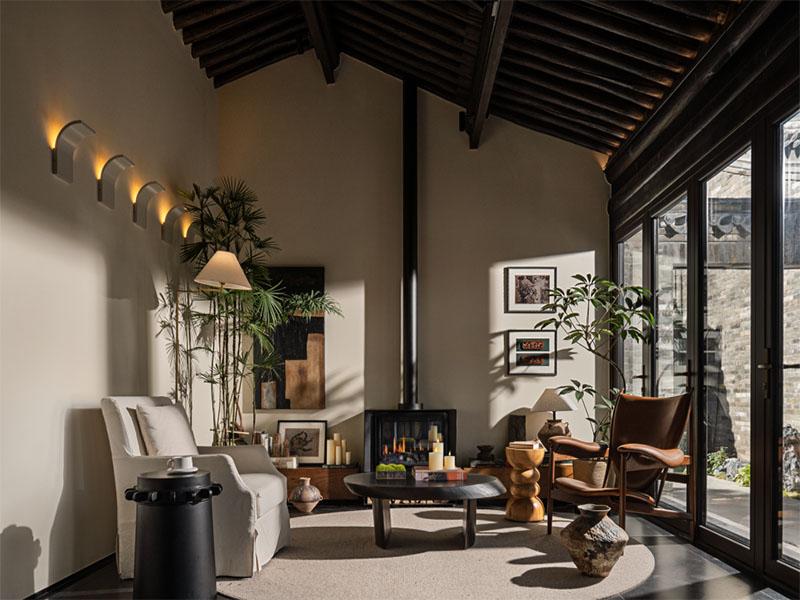 成都民宿的核心竞争力,在于对“川式安逸”的精准诠释。壹西格玛在本案设计中,以川西民居为基底,保留了传统木梁坡顶的结构肌理,用深炭化木梁呼应成都老院的烟火气,同时以米白微水泥墙面做中和,既保留了地域辨识度,又避免了传统中式的厚重感,完美适配成都客群对松弛感的追求。公区休闲区以自然采光为核心,弧形壁灯营造出柔和光影,搭配蒲葵绿植、粗陶器皿与侘寂风家具,打造出可打卡、可休憩的复合型空间,既满足了游客的拍照需求,又贴合成都人“慢生活”的消费习惯。