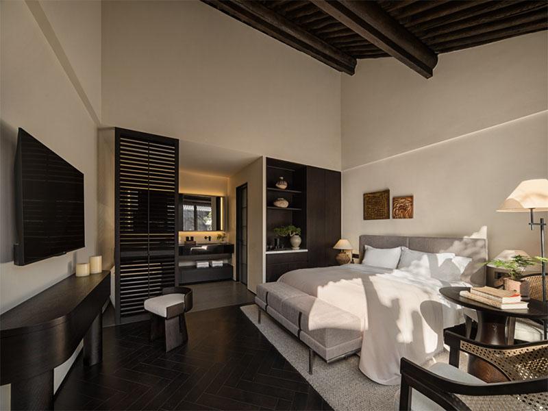 功能布局是民宿装修的核心,壹西格玛针对成都民宿的运营痛点,做了精细化优化。客房采用“睡眠区+休闲区+卫浴区”的通透式布局,用木质百叶门做软隔断,既保证了空间的开阔感,又实现了功能分区;私汤泡池区与客房做了干湿分离设计,选用雅安青石板等本地耐腐石材,适配成都潮湿气候与温泉水的腐蚀性,同时做好防水与隔音处理,避免邻里干扰。公区动线规划上,兼顾了私密性与通达性,用绿植、竹编隔断做分区,既保护了泡汤客人的隐私,又不影响公共空间的通透感。