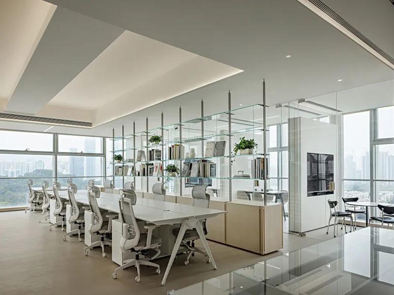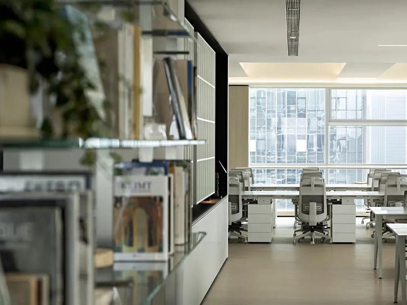 空间布局上,我们科学划分功能区域,实现动线流畅、层次分明。开放办公区采用大平层布局,搭配整面落地玻璃窗,最大化引入自然光与城市山景,搭配通透玻璃置物架分区,既不遮挡光线,又兼具收纳展示功能。成都壹西格玛设计团队注重细节,选用人体工学椅与可移动文件柜,搭配绿植点缀,弱化办公空间的冰冷感,营造松弛高效的协作氛围。