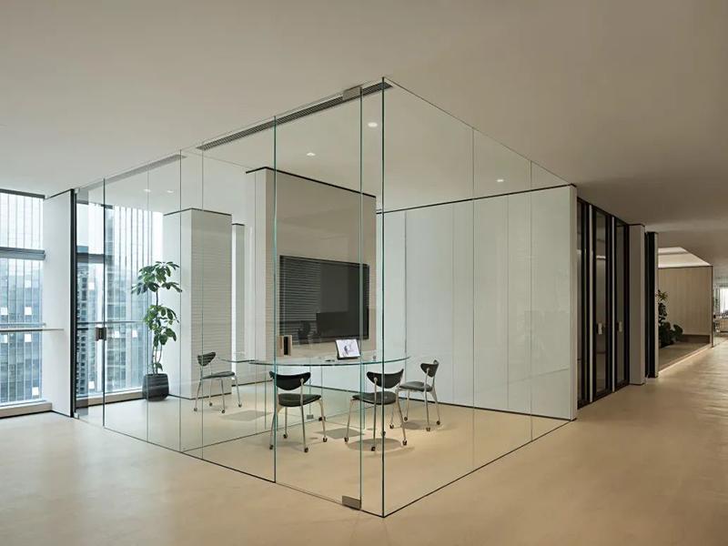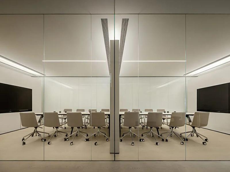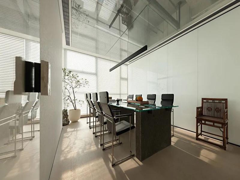 独立高管办公区与会议室设计更具巧思,高管区整合办公、会议、休闲功能,深灰色木饰面搭配深色地板,彰显商务沉稳感,全景落地窗将景观尽收眼底;会议室采用全玻璃通透隔断,兼顾私密性与采光,适配不同规模的会议需求。