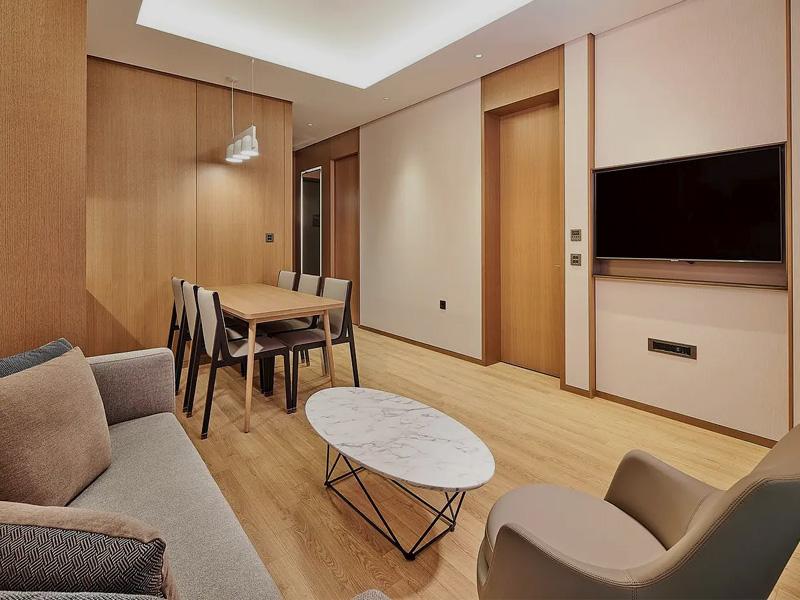 步入空间,暖调原木材质成为空间的基底,温润的木饰面从地面延伸至柜体,搭配浅米色墙面与白色软装,构建出柔和雅致的空间基调。这种材质的选用,既呼应了自然生态的居住理念,也让成都酒店套房设计的温馨感与高级感兼具,打破了传统酒店空间的冰冷感,让每一位入住者都能感受到家一般的舒适与自在。