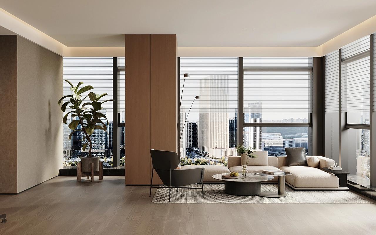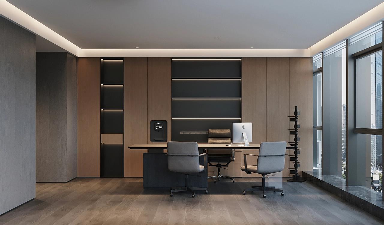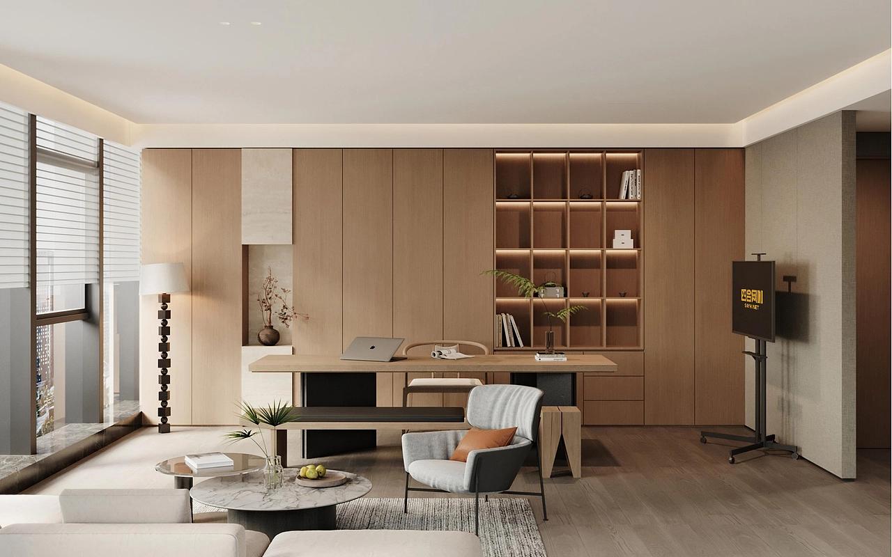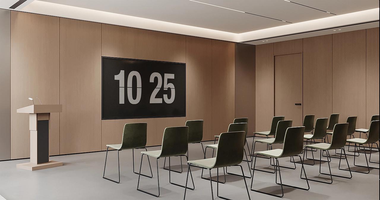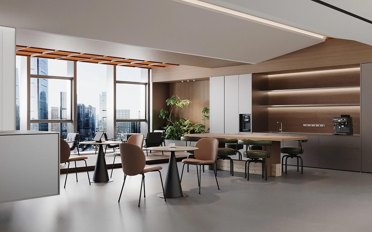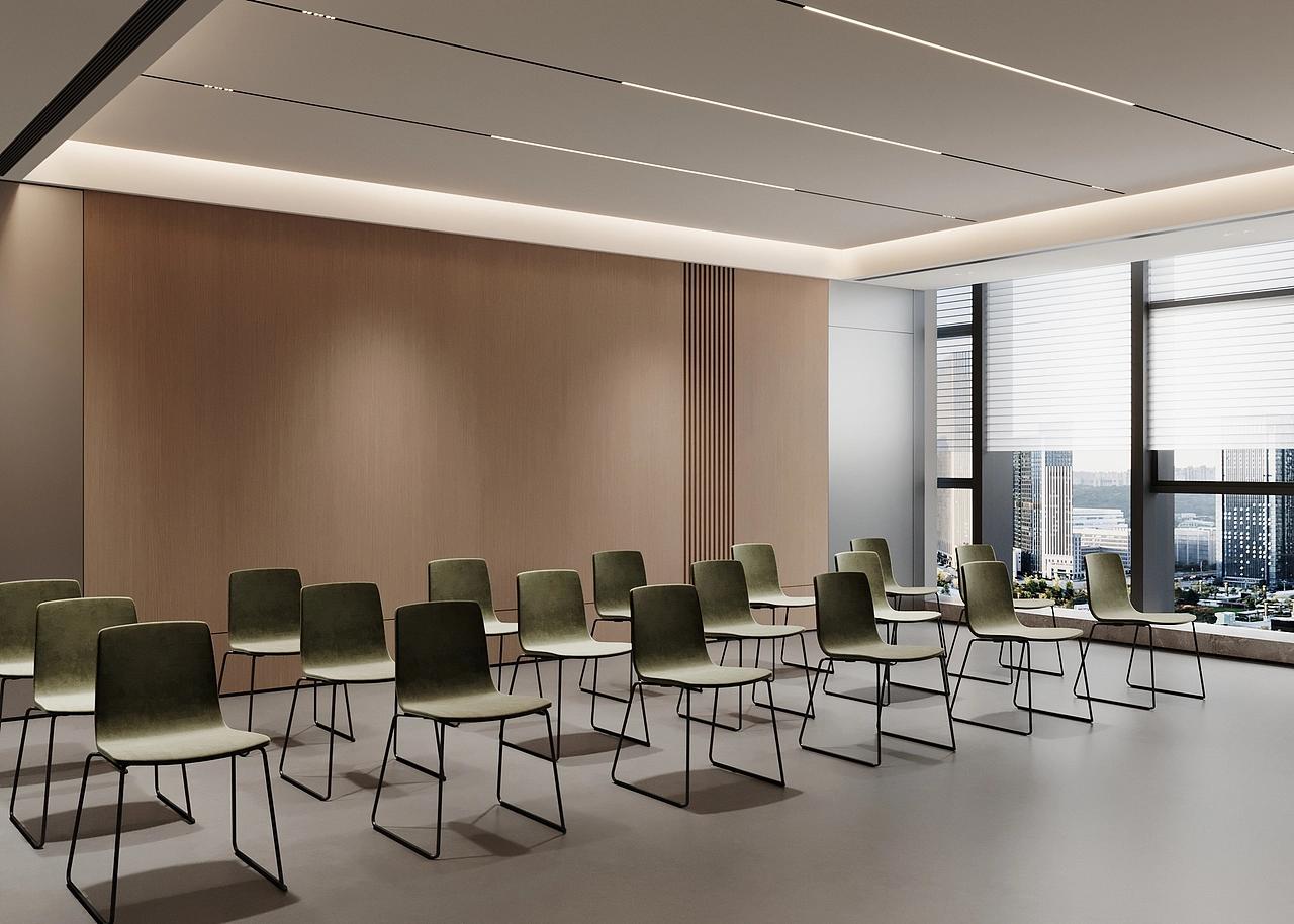 茶水休闲区以全景落地窗引入高新区城市天际线景观,搭配错落的休闲桌椅与中岛吧台,打造出放松的社交与休憩空间,绿植与暖调氛围灯的融入,让员工在高强度工作间隙能够舒缓压力、激发创意,实现工作与生活的平衡。多功能培训室与独立办公区则延续了整体简约调性,无主灯线性照明搭配木饰面背景墙,简洁大气的设计适配会议、培训、高管办公等多元场景,同时预留了灵活改造的空间,满足企业规模扩张后的功能调整需求。