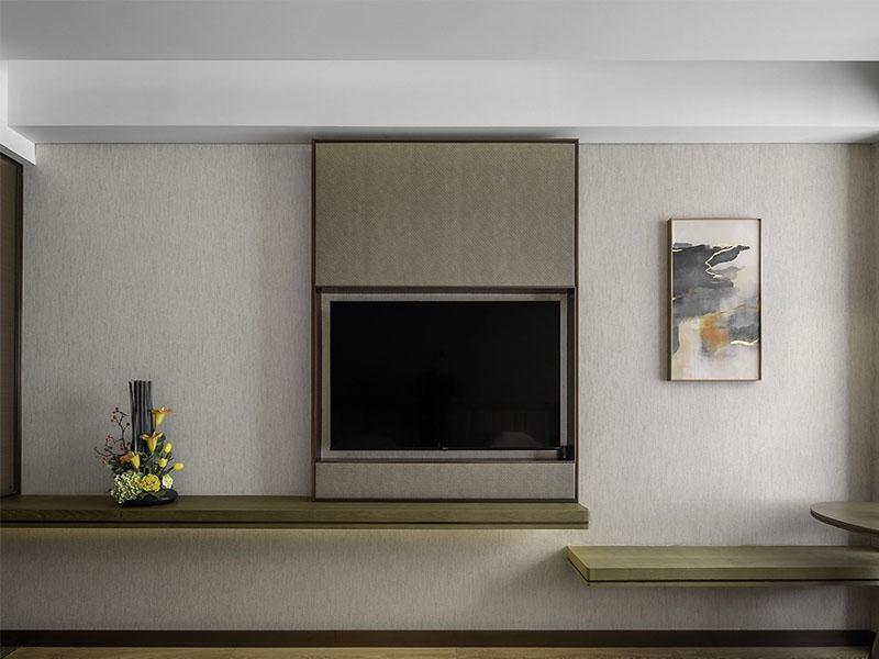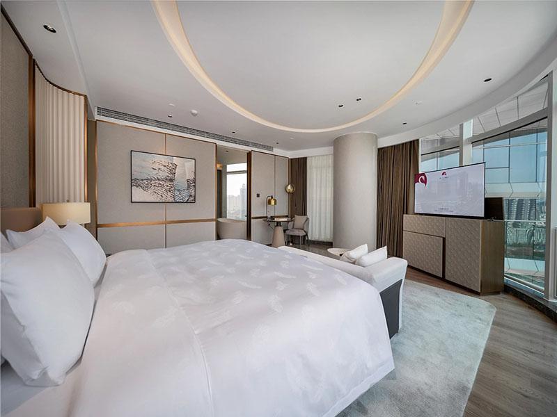 客房休息区是酒店体验的核心,也是本次酒店设计的重点。我们以温润的木饰面与浅灰软包为基底,打造出三种不同风格的客房方案,适配不同客群需求。客房摒弃了繁复装饰,以简洁的线条勾勒空间,嵌入式电视背景墙与悬浮置物台,既保证了视觉的整洁感,又提升了空间利用率;弧形吊顶、柔和壁灯与通透纱帘的搭配,营造出静谧舒适的睡眠氛围,让住客在旅途中也能享受到家的温暖。江景客房则以全景落地窗为亮点,将城市天际线引入室内,弧形软包床头与金属线条点缀,在现代感中融入轻奢质感,满足高端商旅客群的需求。
