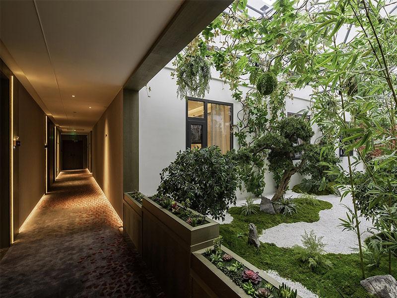 公共走廊区与景观庭院区,是本次酒店设计的点睛之笔。走廊以暖光氛围灯与艺术地面打造出归家感,旁侧的天井庭院引入自然造景,将东方园林的雅致融入酒店空间,让住客在穿行时也能感受到自然的治愈,打破了传统酒店走廊的压抑感,完美契合成都人对松弛生活的追求。