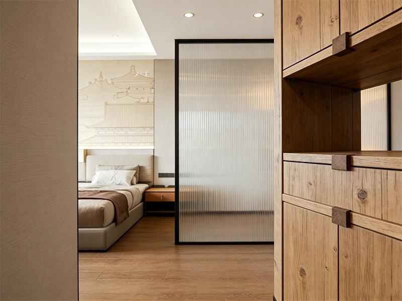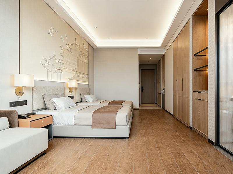 公区与功能区设计上,充分利用 800㎡的空间尺度,打造兼具颜值与实用性的过渡空间。采用原木定制储物柜与长虹玻璃隔断结合的设计,划分出储物区、过渡区,既保证了空间的整体性,又实现了功能分区;地面通铺木纹砖,搭配无主灯设计,营造出温润、大气的空间氛围,契合龙泉驿高端酒店的定位。同时,在细节中融入蜀地元素,如古建筑主题墙绘、中式造型床头背景,让每一处空间都传递出成都的文化底蕴。