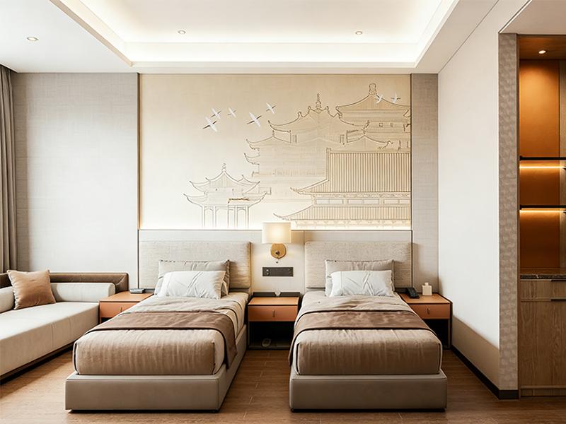在客房设计上,针对 800㎡的空间规划,打造出单人间、双床房等多元房型,满足不同客群需求。单人间以长虹玻璃做干湿分离隔断,既实现了卫浴区与休息区的视觉通透,又保障了隐私;床头背景墙融入成都古建筑线描墙绘,将蜀地文化融入细节,搭配原木定制柜体,兼顾收纳与美观,营造出静谧舒适的休憩氛围。双床房则延续统一风格,扩大空间动线,适配商旅出行、家庭出游等场景,同时通过嵌入式灯光、软包床头,提升居住舒适度。