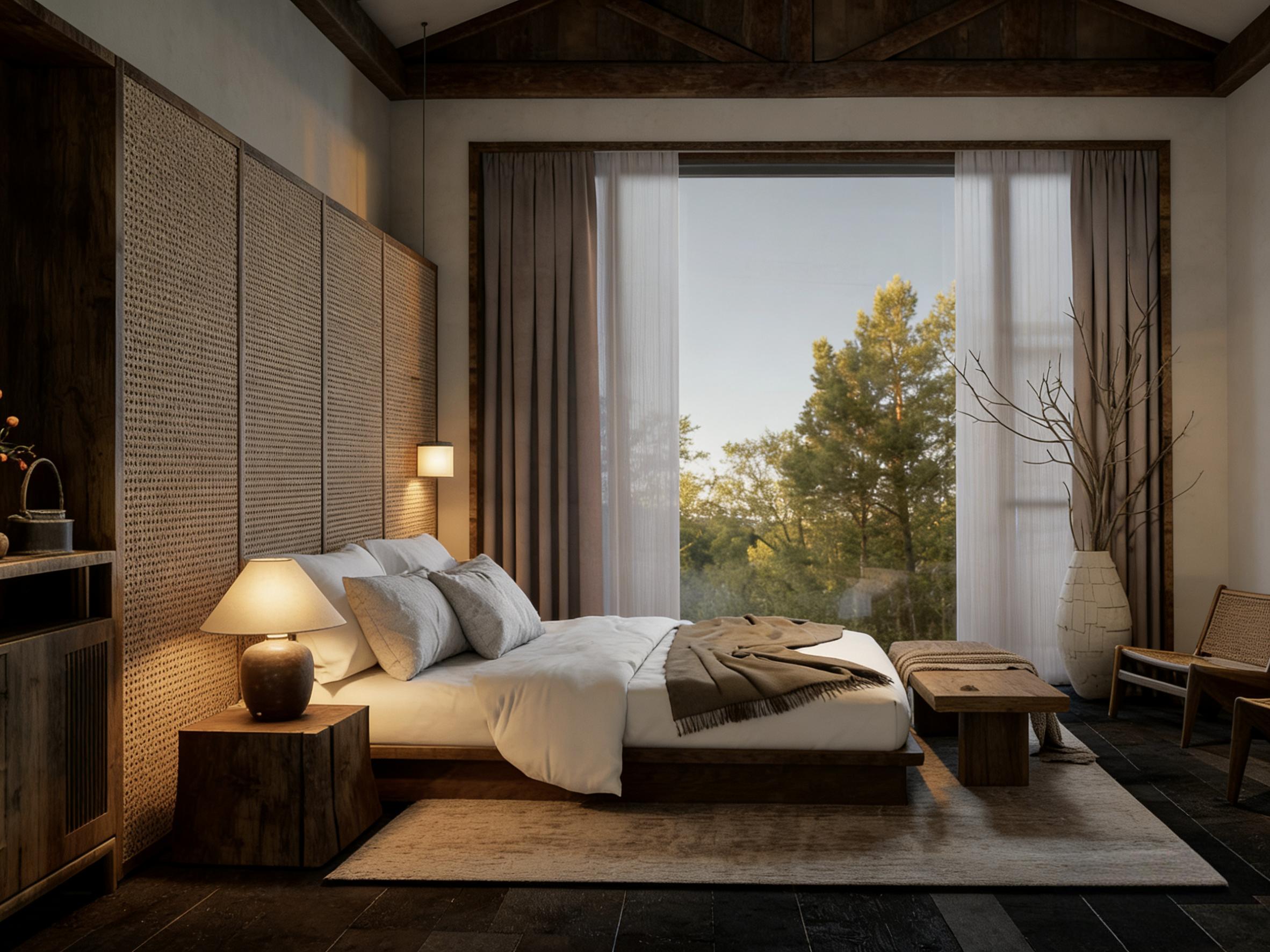 墙面设计是侘寂美学的集中体现。床头背景墙摒弃了繁杂的造型与华丽的饰面,采用藤编纹理板材与实木柜体组合而成。藤编的天然肌理带着手工的温度,浅棕色调柔和不张扬,与深胡桃色实木柜体形成层次对比,既丰富了墙面细节,又没有破坏空间的整体静谧感。左侧定制的实木收纳柜,做旧的木面与格栅设计,兼具收纳功能与装饰性,柜面摆放的枯枝、陶罐等侘寂风软装,以残缺、朴素的形态,传递出“留白即美”的东方禅意,让每一处细节都充满松弛感。