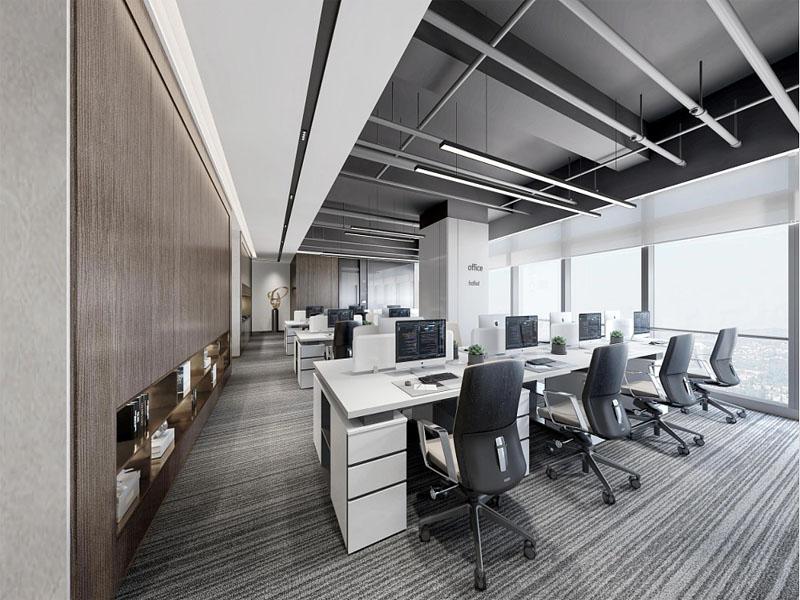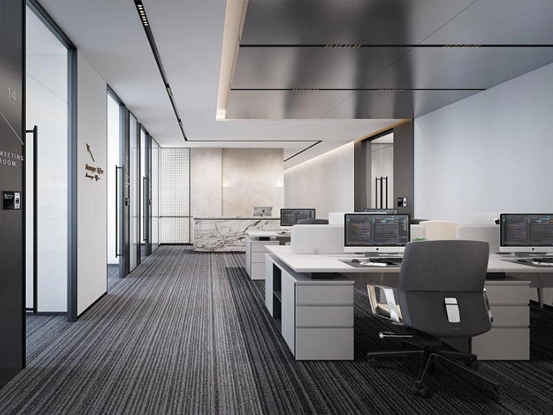 本项目办公空间整体以现代简约为核心设计基调,摒弃繁复装饰,通过简洁的线条、纯粹的色彩与质感丰富的材质,构建出通透大气的空间氛围。开放办公区采用规整的模块化工位布局,浅灰色系地毯奠定沉稳基调,白色柜体与浅木饰面形成柔和视觉呼应,搭配无主灯线性照明系统,既保证了办公区域的采光通透,又营造出舒适高效的工作环境,契合现代企业团队协作的办公需求。