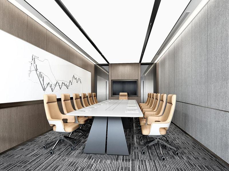 会议空间作为商务交流的核心载体,设计上强调规整性与功能性。长条形会议桌搭配简约皮质座椅,线条利落的白色柜体与灰色墙面形成层次对比,超大白板与隐藏式设备接口的设计,适配各类商务会议、方案研讨的使用需求。顶部线性灯带与嵌入式筒灯的组合,让空间光线均匀柔和,保障会议过程的专注与高效。