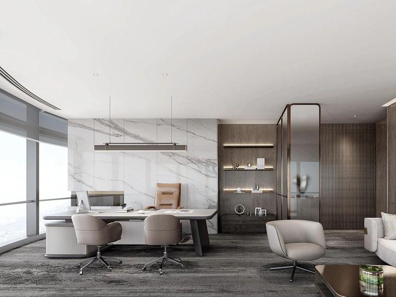 独立办公区域注重私密性与舒适度的平衡,浅米色软包墙面与温润的木质柜体相互映衬,大理石材质的点缀提升空间质感,简约办公椅与舒适的休闲座椅搭配,让商务洽谈与休憩场景自然衔接,既满足了商务沟通的正式需求,又兼顾了员工放松的个性化场景。