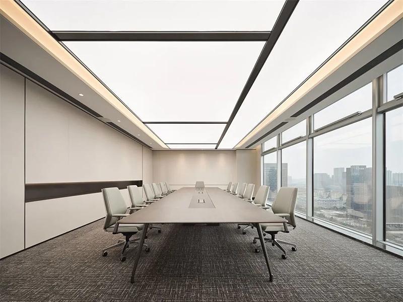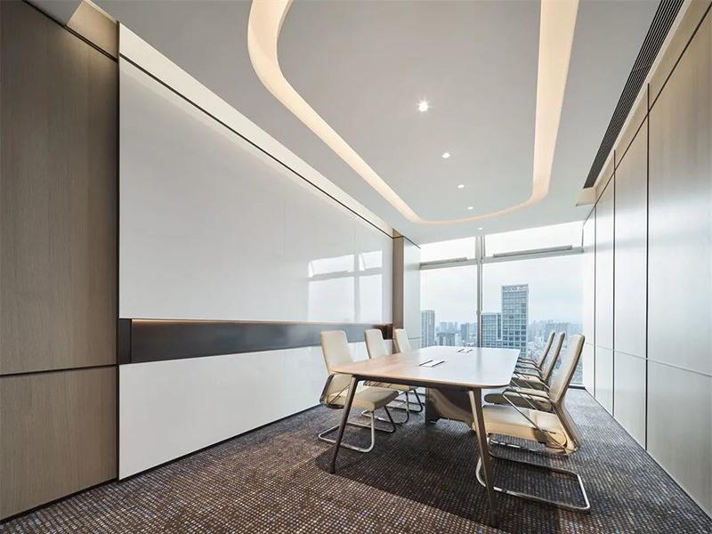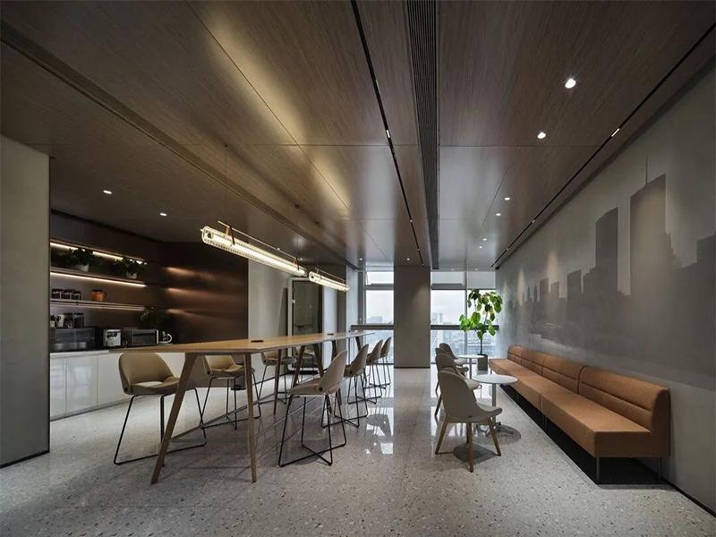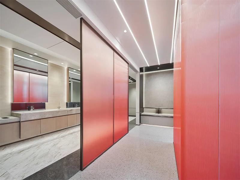 电梯厅作为企业的“第一印象窗口”,采用对称式布局,线性灯带有效延伸视觉纵深感,搭配简约艺术摆件,让来访客户瞬间感受到企业的专业素养;会议区按需求区分大小规格,小型会议室适配部门日常沟通,弧形吊顶与落地玻璃窗营造出轻松高效的交流氛围,大型会议室则配备回字形软膜灯与全景落地窗,可满足10-15人的大型汇报、跨部门协作等需求;员工休息区与茶水间实现一体化设计,水磨石地面搭配木饰面吊顶,长条餐桌与休闲沙发错落排布,微波炉、咖啡机等设备一应俱全,成为员工放松身心、交流灵感的专属角落。即便在卫生间的设计上,我们也毫不敷衍,渐变红色玻璃隔断打破单调,大理石台面与智能镜进一步提升使用体验,细节之处尽显企业对员工的关怀。