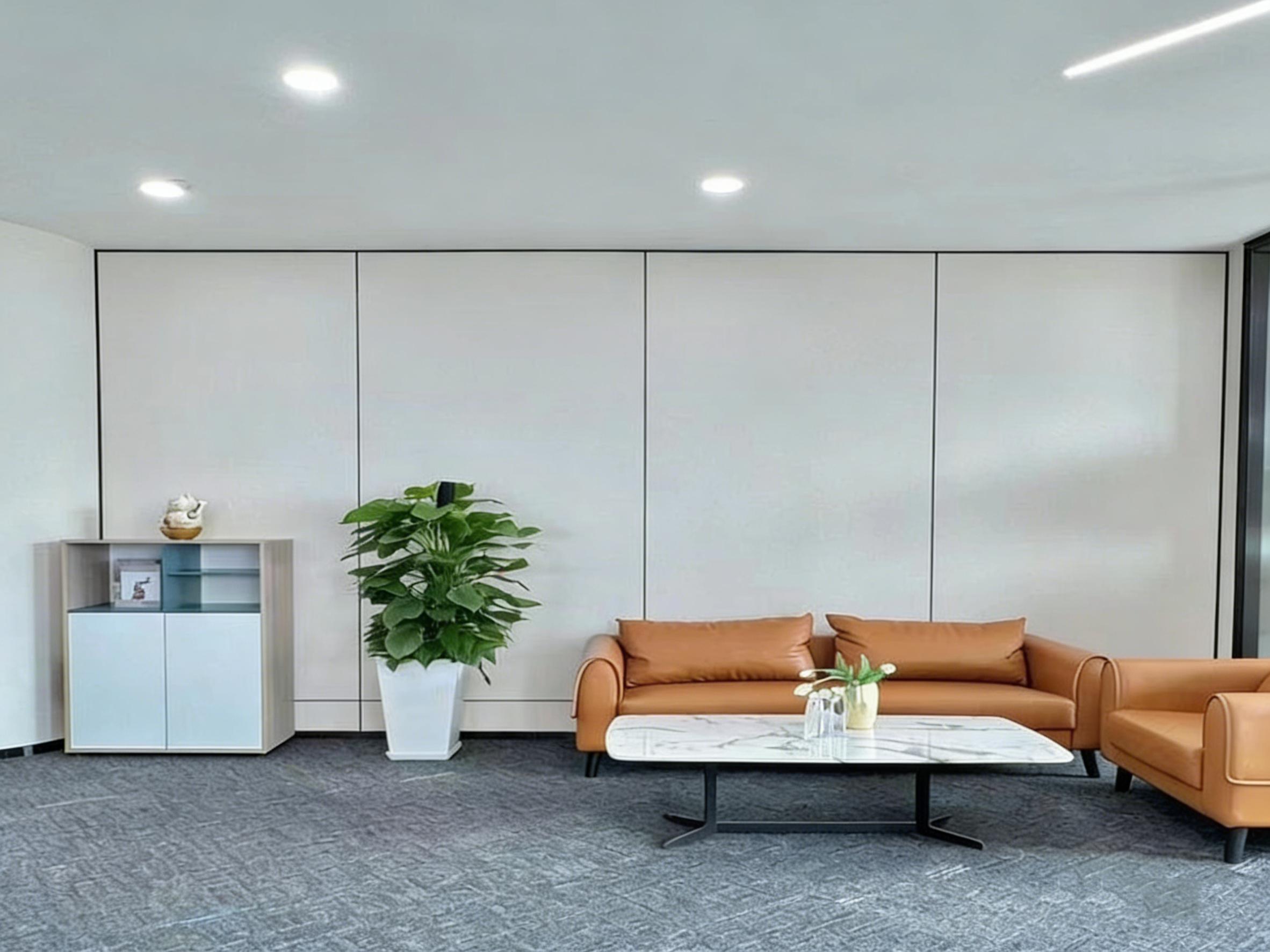 空间布局遵循 “开放为主、分区精准” 的原则,将 860㎡划分为开放办公区、独立洽谈区、高管办公室及休闲休憩区四大核心板块。开放办公区采用模块化工位布局,搭配浅灰色耐磨地毯与简约白色工位柜体,既保障了团队日常协作的便捷性,又通过合理的工位间距预留出灵活调整的空间;大面积落地窗引入充足自然光线,搭配顶部线性灯具与嵌入式筒灯组成的无主灯设计,让光线均匀洒落,彻底告别传统办公的昏暗压抑,让每一寸空间都充满通透感与明亮度。独立洽谈区以暖橙色皮质沙发搭配大理石茶几,柔化空间冷硬感,结合背景墙的简约木质饰面包边,营造出舒适且不失商务质感的洽谈氛围,为商务沟通提供松弛且专业的场景支撑。