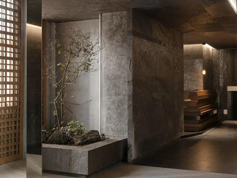 在空间规划上,我们兼顾了多元办公需求:用全玻璃隔断划分独立办公室与小型会议区,既保障了私密性,又不阻断自然光的穿透;沿窗打造的通长吧台与高脚凳,成为员工休闲交流、临时会议的灵活空间;入口处的禅意造景区,以混凝土花池、山石与枯树营造东方意境,为办公空间注入自然生机,也让访客进门就能感受到品牌的审美格调。