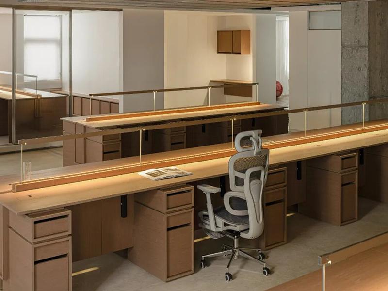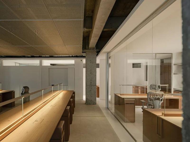 这套项目的核心,是将侘寂风的温润与工业风的粗粝完美融合,打造出松弛又高级的办公氛围。我们保留了原始的混凝土梁柱与裸露管线,用最本真的建筑结构奠定空间的工业基底,同时以温润的原木家具、通透的玻璃隔断中和冷硬感,让整个空间既有力量感,又不失温度。开放式工位采用通长式原木台面,搭配内嵌线性灯带与玻璃软隔断,既保证了团队协作的便利性,又为每个工位保留了独立感,桌面下方的嵌入式抽屉,更是最大化利用了收纳空间,让办公环境整洁有序。