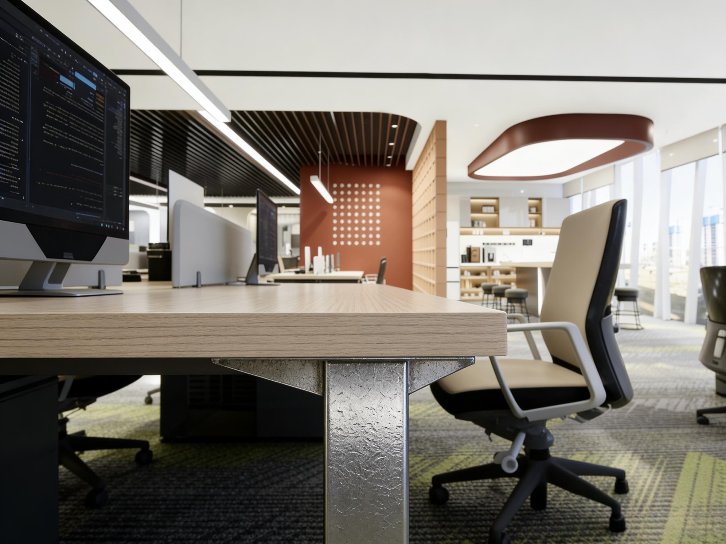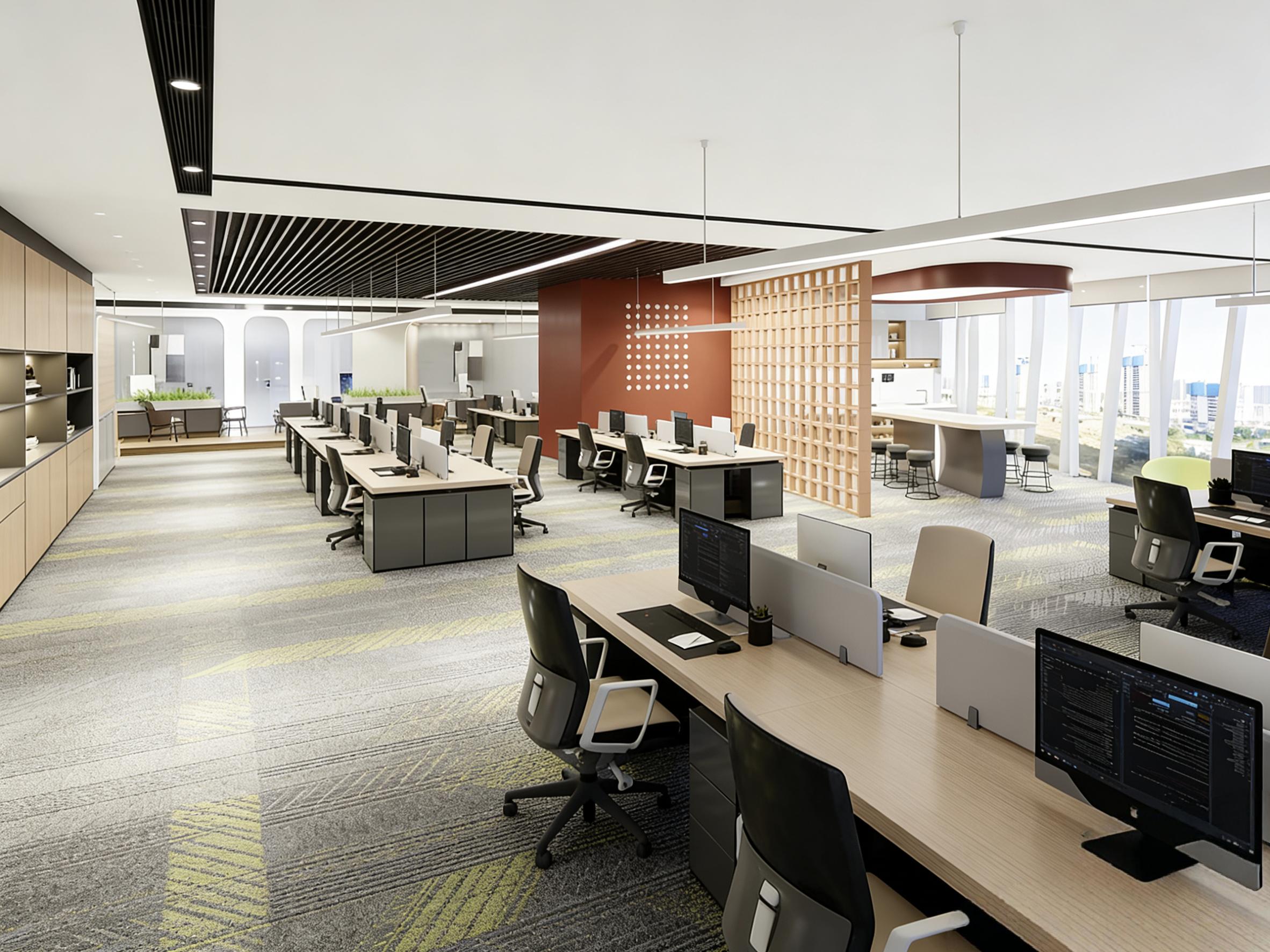 - 半通透隔断区:原木格栅屏风作为空间过渡,既实现了区域划分,又保持了空间的通透感,将开放办公区与休闲洽谈区自然分隔,让空间层次更丰富。