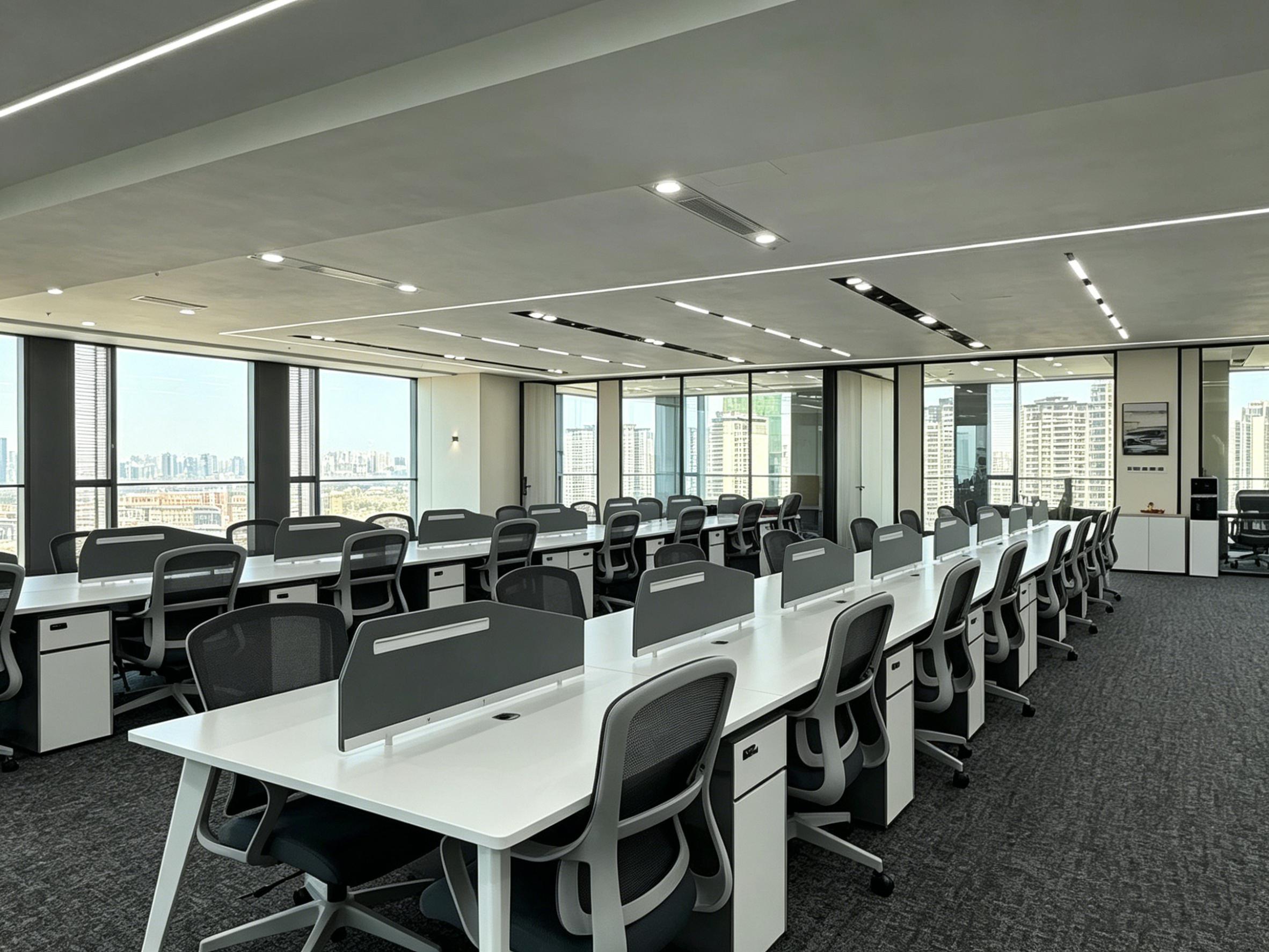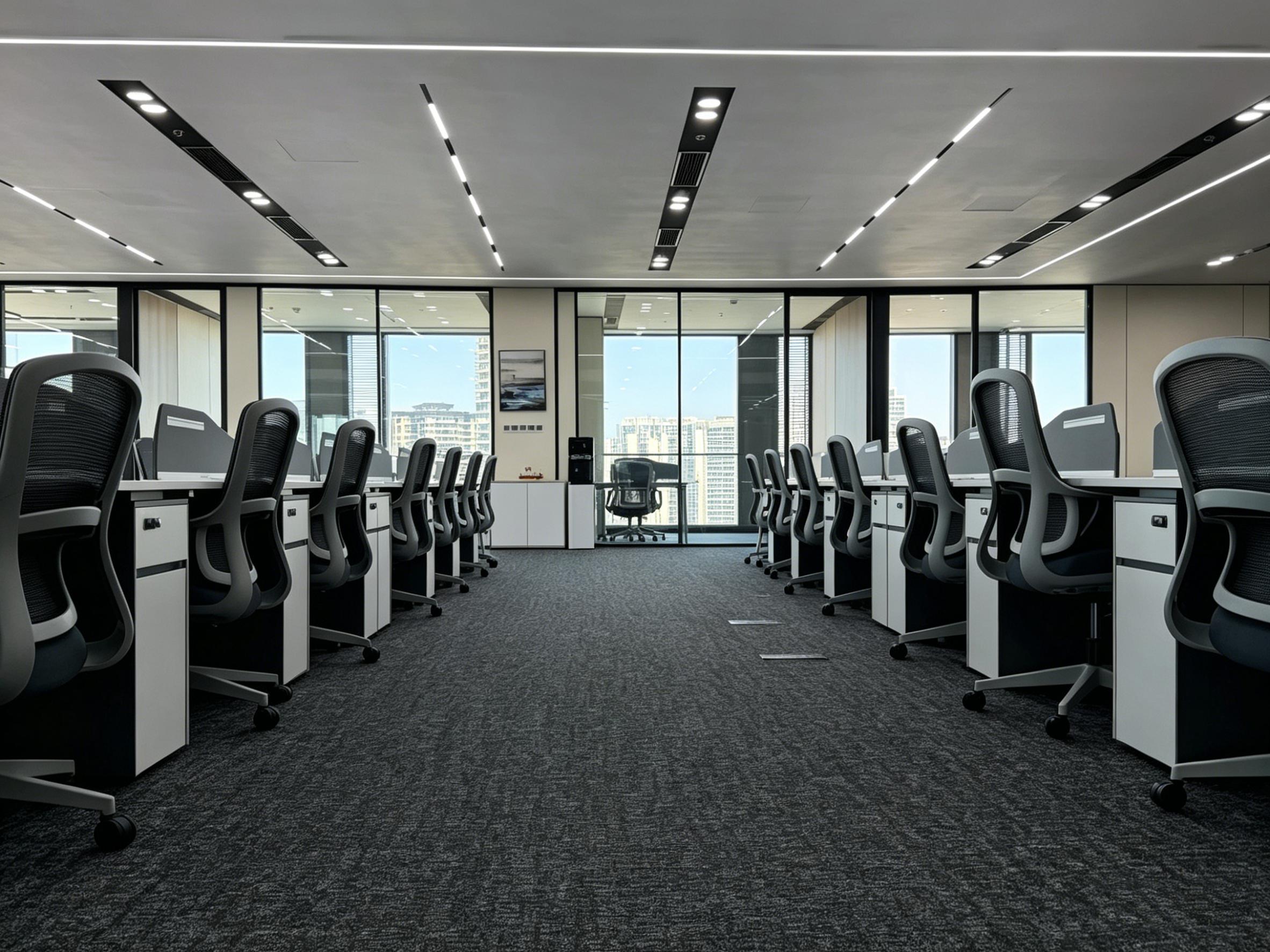 在细节设计上,四川壹西格玛建筑工程有限公司始终秉持「工装精细化」的理念:顶面采用无主灯线性照明系统,搭配隐藏式空调与消防设施,让空间更整洁统一;地面通铺高质感地毯,有效降低办公噪音,提升空间静谧性;玻璃隔断的应用既实现了空间的通透感,又保障了独立区域的私密性,同时优化了办公动线,让各功能区衔接更流畅。此外,团队在施工中严格把控材料环保性与施工工艺,确保项目高效落地,为企业打造了健康、安全的办公环境。