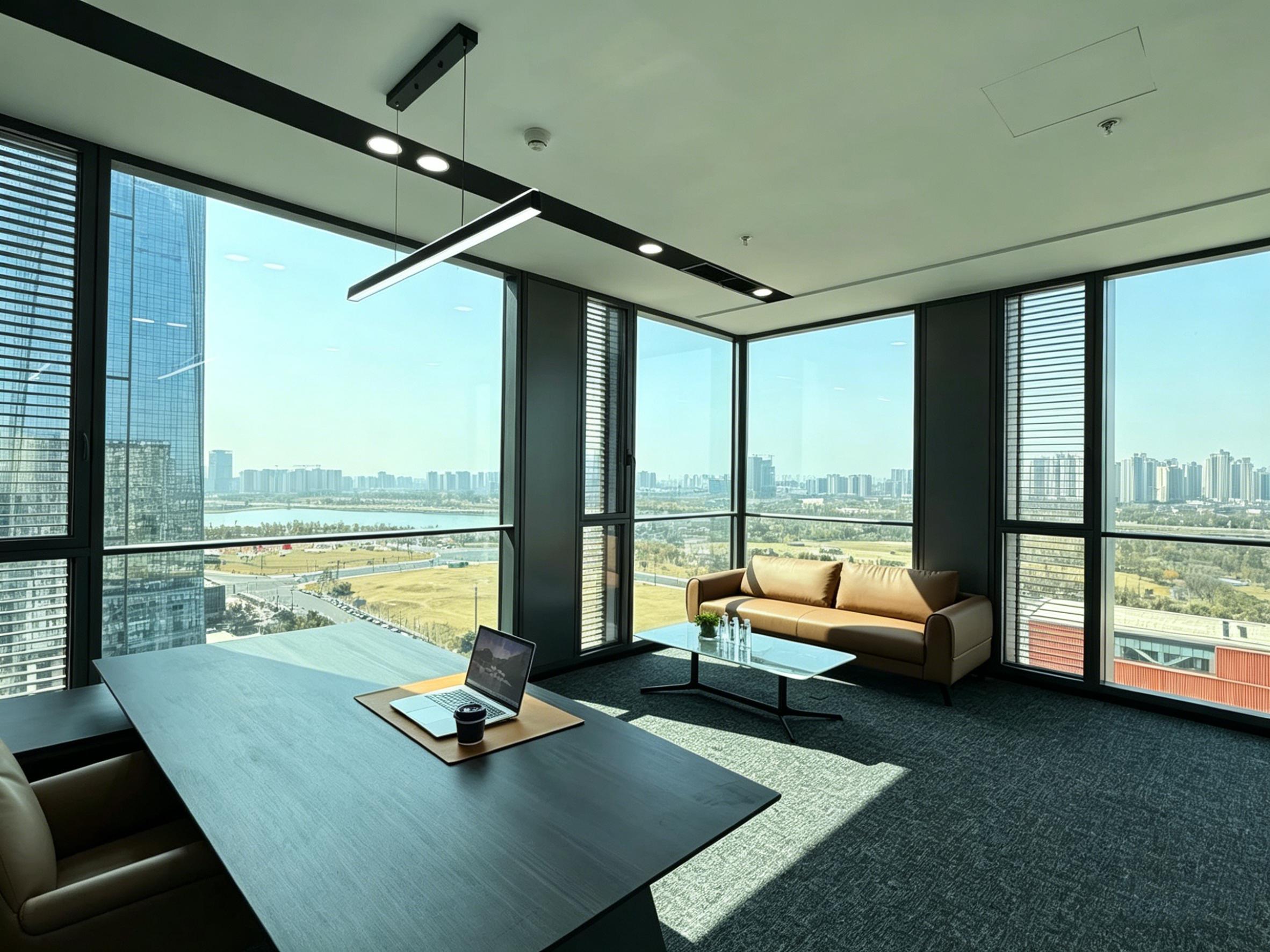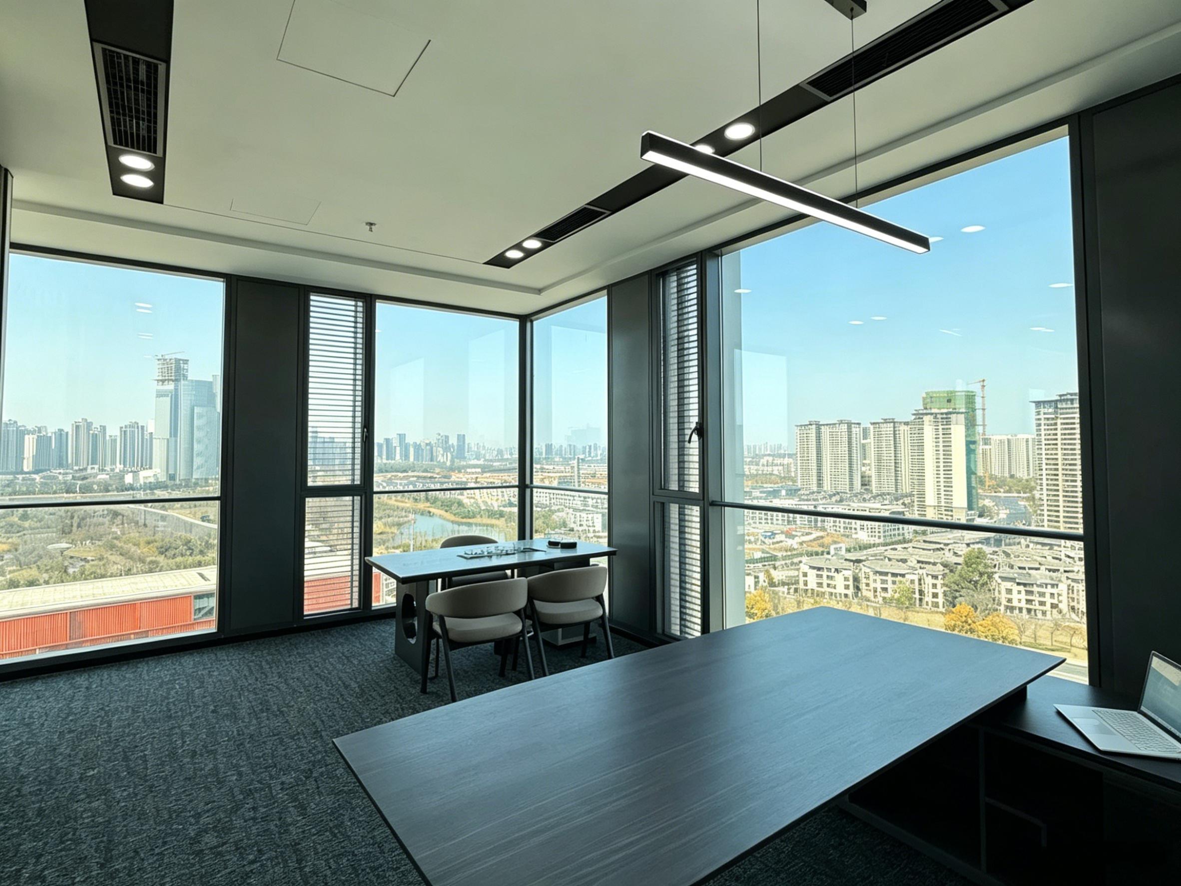 项目整体采用现代简约风格,以黑白灰为主色调,搭配原木质感与通透玻璃,既保留了商务空间的专业感,又通过大面积落地窗引入充足自然采光,让整个办公空间明亮开阔。在空间规划上,团队针对科创企业的办公特性,打造了分层式功能布局:开放办公区采用模块化工位设计,搭配可调节办公椅与隐私隔断,在保障团队协作效率的同时,兼顾员工的独立办公需求;多间独立会议室以吸音墙面、线性照明与人体工学座椅为核心,适配日常会议、方案评审等多元场景,打造沉浸式沟通空间;高管洽谈区则以全景落地窗、皮质沙发与极简办公桌为核心,营造出高端商务的洽谈氛围,同时保留了充足的采光与视野,提升商务接待的体验感。