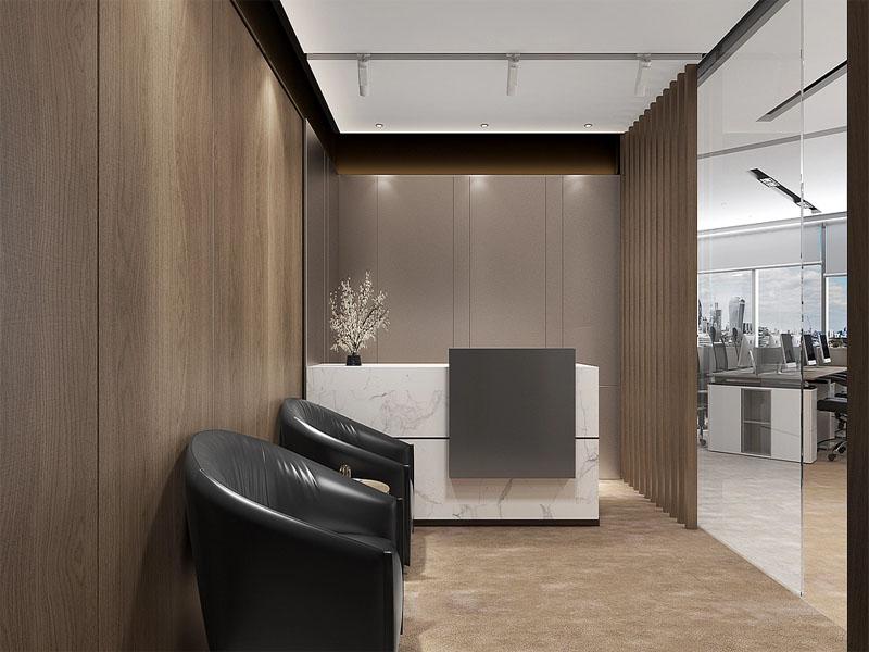 项目以 “简约而不简单” 为设计核心,整体空间以温润的原木饰面为基底,搭配高级灰大理石、哑光白墙面与线性灯光,构建出沉稳大气、层次丰富的视觉体系。在接待区,原木格栅与玻璃隔断打造出半私密的等候空间,搭配质感沙发与大理石前台,既保障了访客的隐私性,又以简约设计彰显企业的高端形象;开放式办公区沿落地窗排布,最大化引入自然采光,搭配简约办公桌椅与智能卷帘,为员工打造开阔、通透的协作环境,提升办公效率。