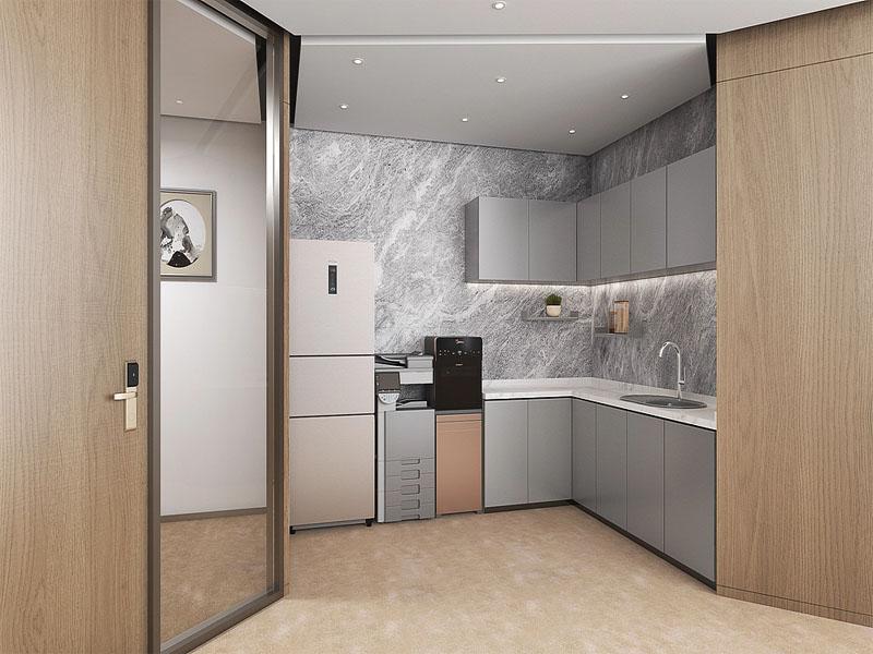 独立功能区与公共配套区则延续了整体风格的统一性。走廊区域以原木与玻璃隔断为主体,嵌入式线性灯营造出沉浸式的空间纵深感,沿墙定制的展示柜与艺术装饰,让动线空间兼具实用性与观赏性;茶水间采用一体化橱柜设计,以灰色岩板与原木饰面形成视觉对比,隐藏式收纳让空间整洁利落,满足员工日常休闲与补给需求,提升办公幸福感。