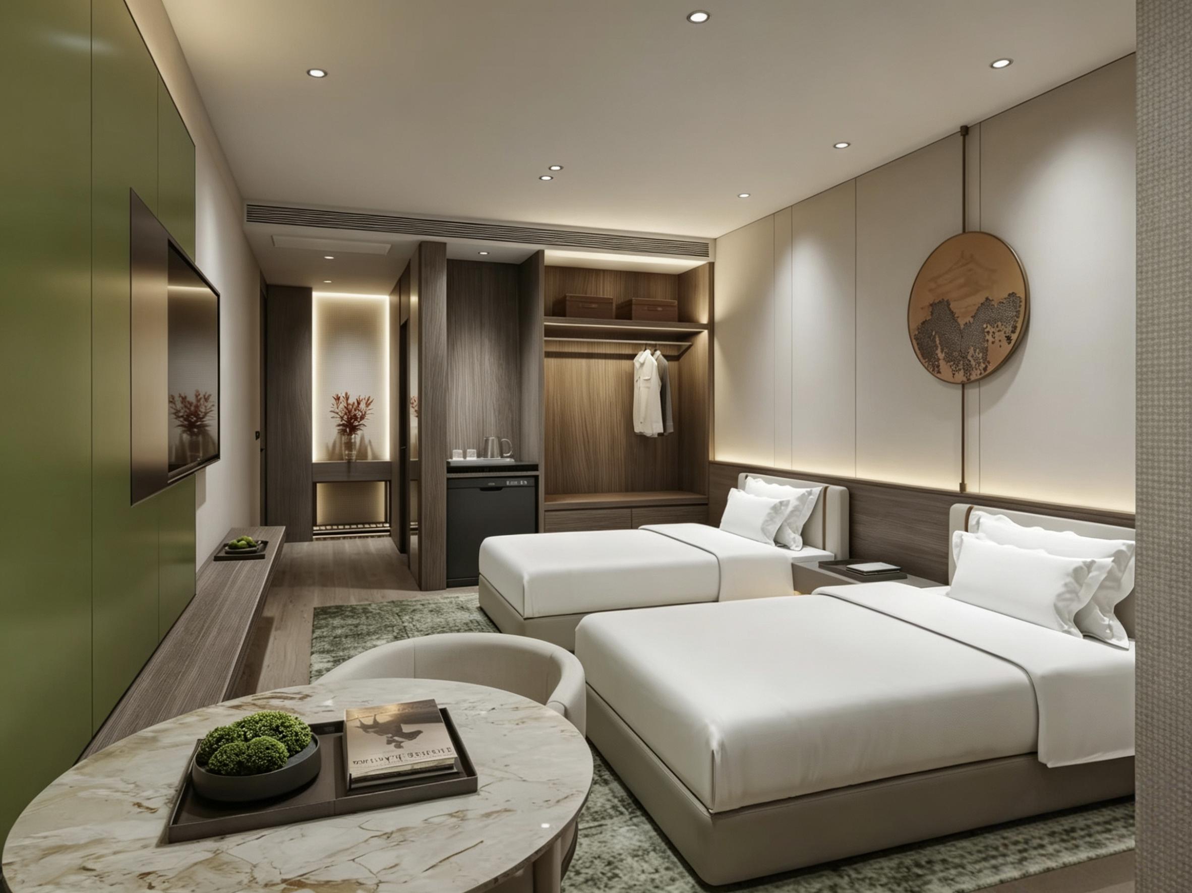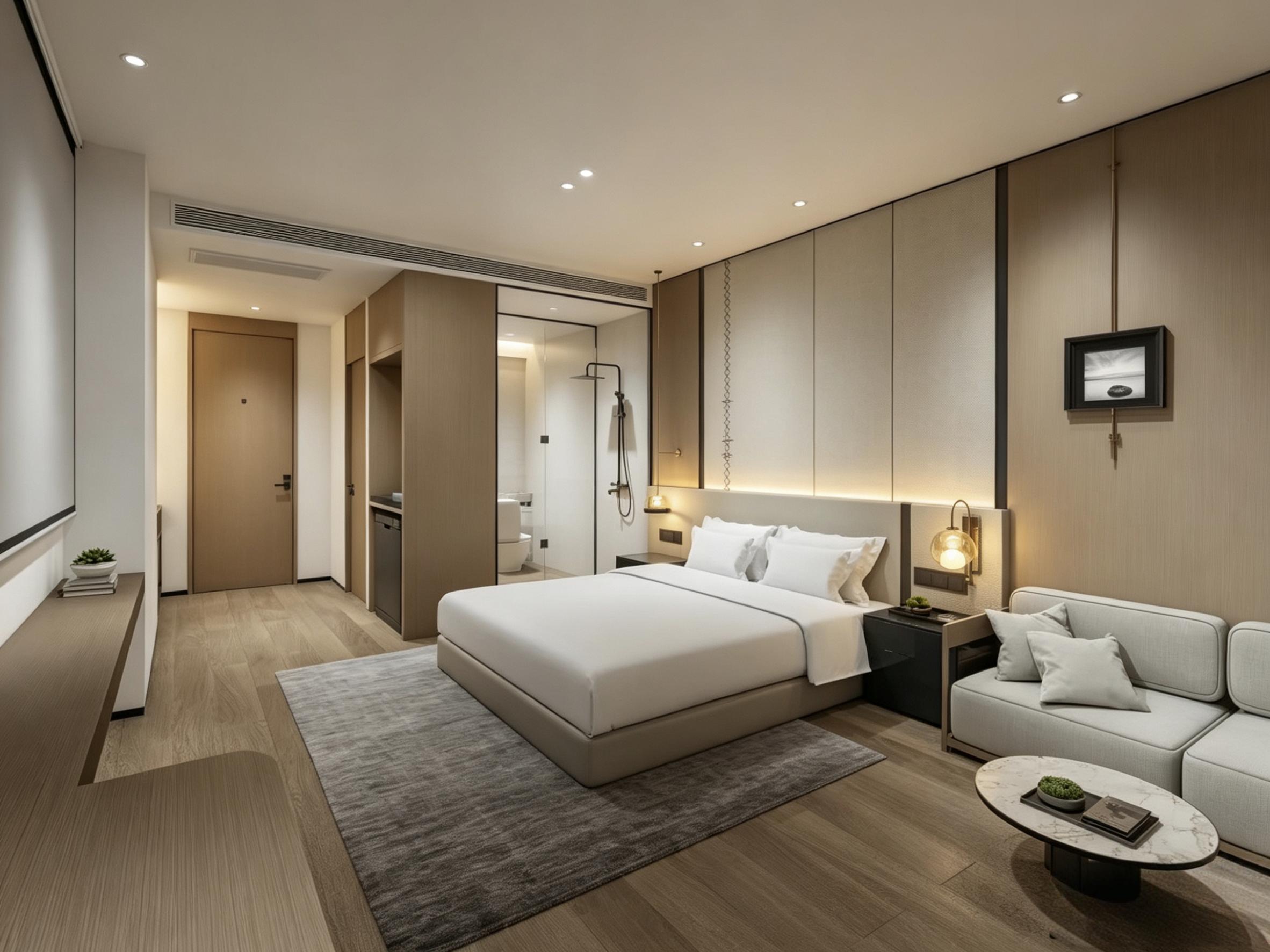 该项目的设计,正是精准把握了这一核心逻辑。一方面,以现代东方美学为载体,融入山水、木质等中式元素,呼应成都的文化底蕴,让住客在入住过程中感受地域文化魅力;另一方面,采用现代简约的设计手法,搭配智能化、人性化的细节设计,满足当代住客对便捷、舒适的需求,适配成都的都市活力。同时,项目在设计过程中,充分考虑成都的气候特点,选用防潮、透气的材质,优化通风与采光设计,让空间更适配本地居住环境。
