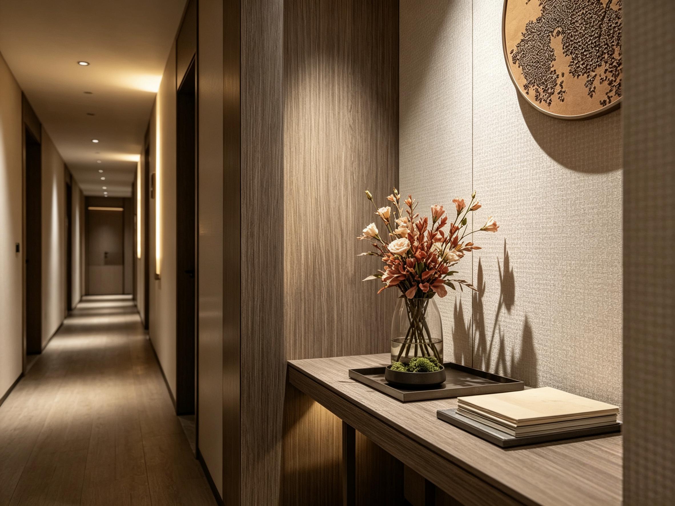 走廊作为酒店的“动线枢纽”,设计上注重氛围感与引导性。项目采用暖色调线性灯光,沿墙面与顶面排布,既保证照明需求,又营造出温馨雅致的氛围,弱化走廊的狭长感;墙面采用木饰面与硬包结合,搭配艺术挂画与花艺装饰,提升空间质感;地面选用防滑耐磨的实木地板,保障住客行走安全,同时提升空间档次。每一处细节都经过精心打磨,让住客在行走过程中,就能感受到酒店的品质与用心。