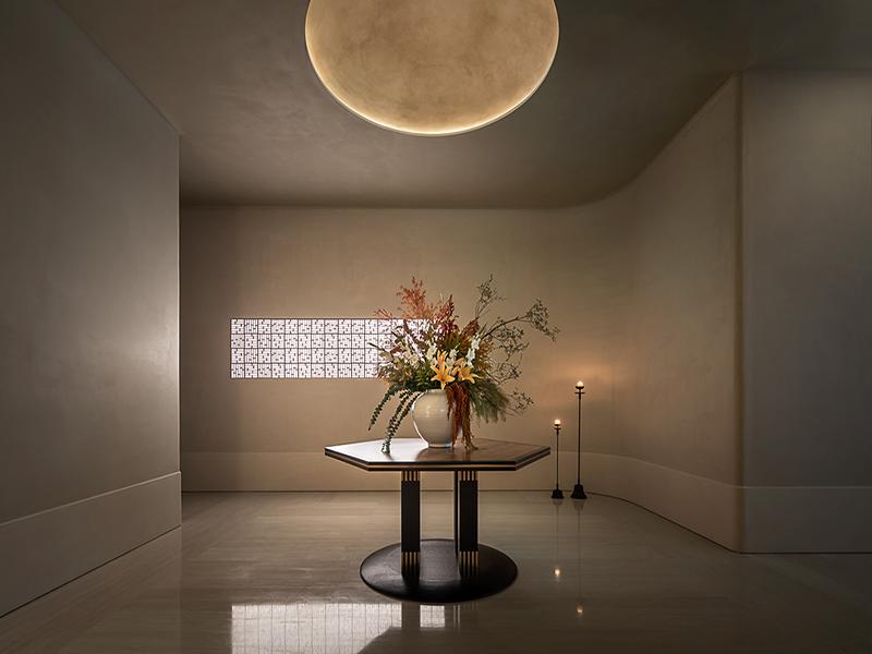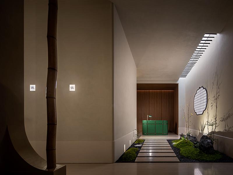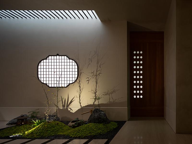 光影是空间的灵魂,也是我们设计的重点。我们采用“无主灯+氛围灯”的多层次设计,前厅圆形穹顶灯模拟天光,营造松弛氛围;嵌入式壁灯与线性洗墙灯柔和勾勒空间轮廓,实现“见光不见灯”的细腻质感;线性天窗搭配海棠形花格窗,让自然光穿透而入,在墙面投射出竹影婆娑,将东方诗意巧妙藏于光影之间,尽显工装设计的细腻与匠心。
