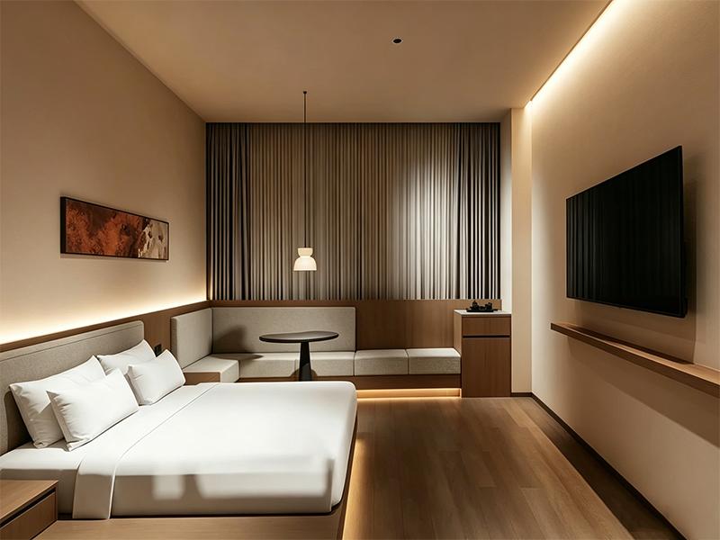 本次设计精准把控 900㎡空间尺度,采用 “动静分区、功能复合” 的布局逻辑,实现空间价值最大化。整体划分为三大功能板块:客房区约 600㎡,规划 12-14 间高端客房,单房面积 40-50㎡,既保障居住舒适度,又兼顾运营效率;公区约 200㎡,打造集大堂、茶歇、轻办公于一体的复合社交空间,衔接东安湖自然景观,让住客在室内即可沉浸式感受湖光山色;配套服务区约 100㎡,涵盖卫浴、储物、设备间等功能,采用隐蔽式管线设计,保障空间整洁与运营稳定。客房内部遵循 “去边界化” 设计,原木地台串联睡眠区与休闲区,搭配全景落地窗,将东安湖景纳入室内,让自然成为空间的天然装饰。