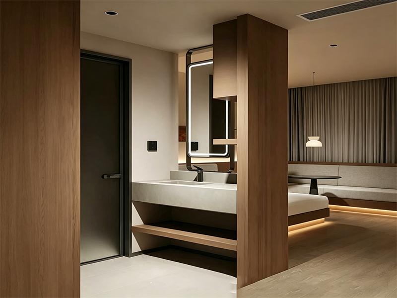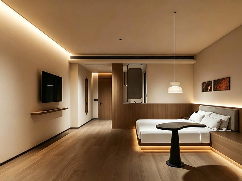 灯光设计遵循 “层次化、氛围感” 原则,打造全场景光影体验。整体采用 “嵌入式筒灯 + 线性灯带 + 局部吊灯” 三重照明体系,色温控制在 2700K-3000K 暖光区间,避免光线刺眼。客房内,床头线性灯带勾勒空间轮廓,休闲区吊灯提供局部照明,卫浴区环形发光镜补光,兼顾功能与氛围;公区采用无主灯设计,灯带与筒灯结合,搭配原木墙面光影变化,打造通透舒适的社交空间,同时融入智能灯光控制系统,支持语音调控,适配多元旅居需求。
