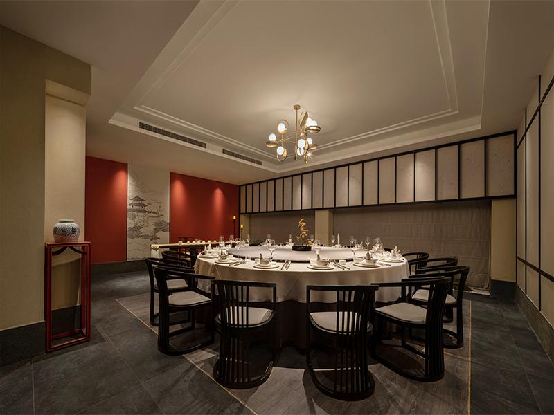 私密包间区是高端宴请的核心场景,也是本次设计的重点。空间以红墙黛瓦、木构线条还原中式雅致,圆形餐桌搭配复古吊灯,既满足多人聚餐需求,又营造出私密雅致的用餐环境;艺术山水挂画与中式摆件的点缀,在暖光氛围中提升质感,让商务宴请与家庭聚餐都能拥有舒适体验,完美契合青羊区餐饮市场的多元需求。