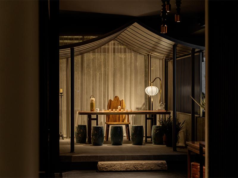 散座用餐区与茶歇区则以通透布局打造开放社交场景,用中式灯笼、纱幔隔断营造层次丰富的用餐氛围,错落的餐桌布局既保障了用餐私密性,又实现了空间的高效利用,适配日常用餐与朋友小聚的多元场景。景观造景区作为点睛之笔,以枯山水、迎客松与雾化造景,将东方园林意境引入室内,既可以作为餐前等候、餐后闲聊的区域,也能成为打卡出片的网红场景,为商业空间赋能引流价值。