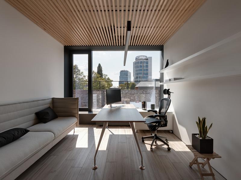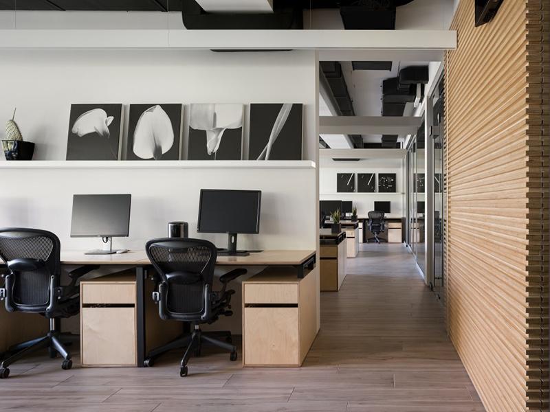 开放办公区是团队协作的核心场景,也是本次办公室室内装修设计的重点。空间以原木格栅、通透玻璃为隔断,在保障采光通透的同时,实现了空间的高效利用;错落的工位布局搭配绿植造景,既弱化了办公的压抑感,又为空间注入自然生机,完美契合成都人对松弛办公的追求。原木立柱与艺术挂画的点缀,在简约基调中提升空间质感,让日常办公也能拥有舒适体验。
