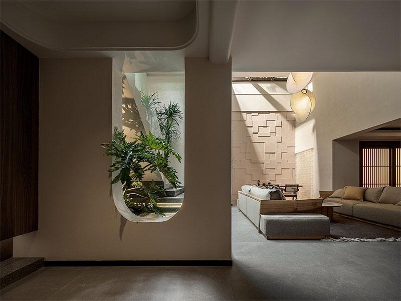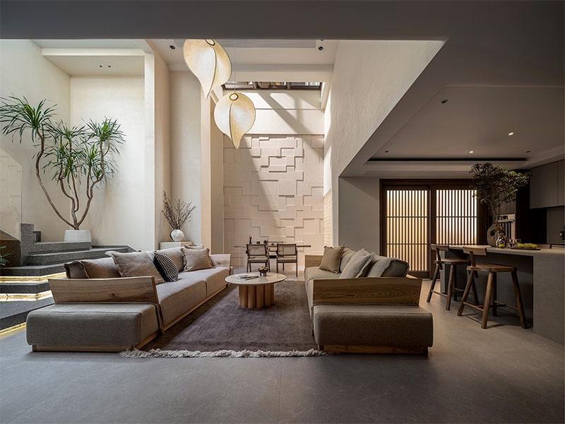 这套设计跳出了传统酒店的“模板化”桎梏,以“自然共生”为核心设计理念,精准契合成都“巴适包容、文旅兴盛”的城市特质,同时兼顾商业运营与居住体验的双重需求。空间整体以低饱和的米白、浅灰与原木色为基底,摒弃繁杂色彩干扰,如同成都锦江流水般温润舒缓,既适配本地客群对松弛感的追求,也满足外地旅人对静谧氛围的需求。材质选择上,大量运用本地天然木材、微水泥与绿植,搭配纤细黑钢线条与磨砂玻璃,实现“柔与硬、朴与精”的平衡,让空间既有大地的温度,又不失现代公装的精致质感。