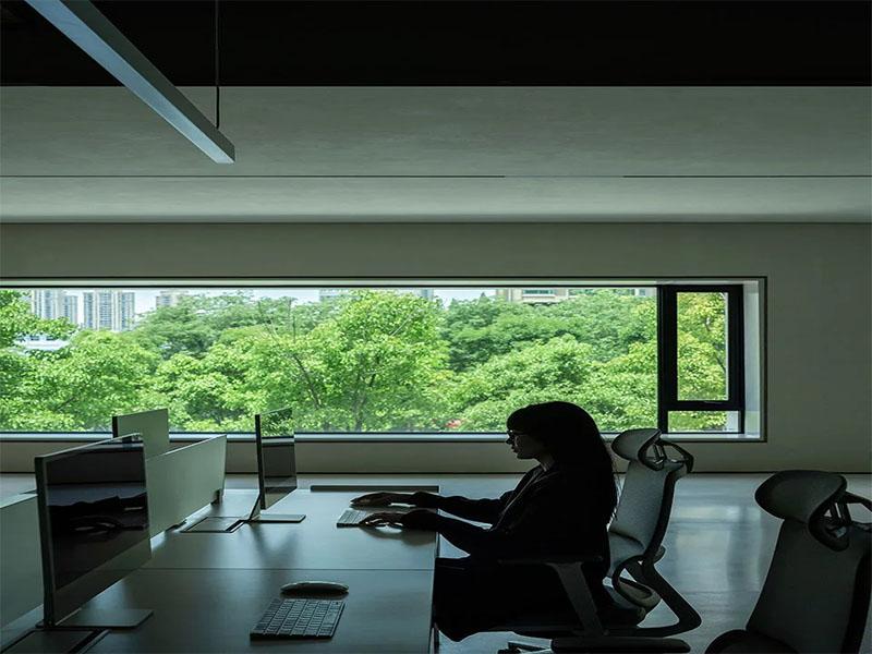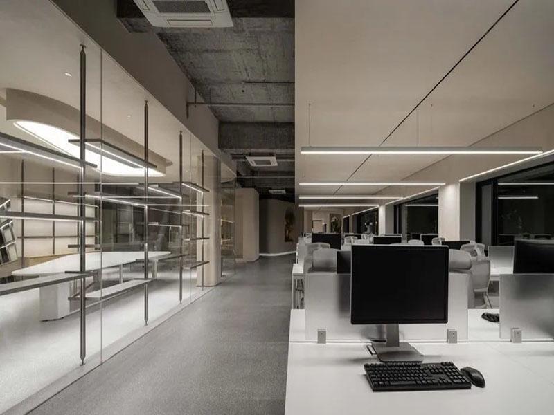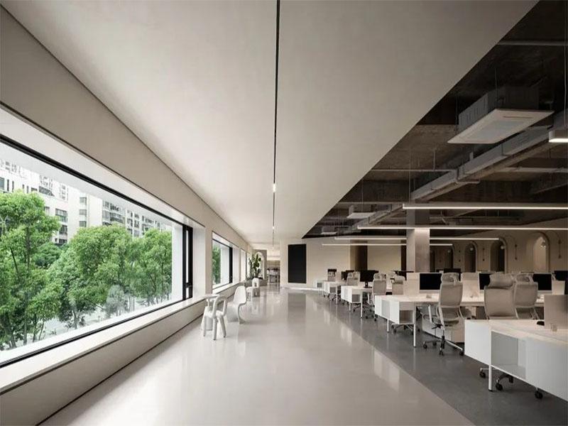 在功能布局上,设计充分兼顾了开放协作与独立专注的双重需求。开放式工位区采用模块化办公桌椅,灵活适配不同团队的协作需求;沿窗设置的休闲洽谈区,搭配全景落地窗,将室外绿意引入室内,为员工提供放松交流的空间;独立的会议区与展示区则通过玻璃与金属线条的组合,既保证了私密性,又不破坏空间的整体通透感。地面采用无缝环氧地坪,顺滑的质感延伸整个空间,进一步强化了极简风格的整体性与高级感。