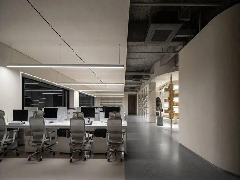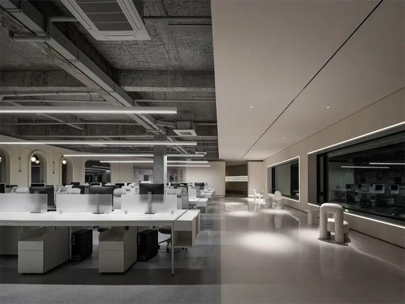 本次打造的办公空间,以“去繁就简,回归本质”为设计理念,将极简美学与功能主义完美融合。空间以米白、浅灰为基底,搭配裸露的原始混凝土顶面,在工业风的硬朗中融入现代极简的柔和,形成层次丰富的视觉张力。开放式办公区采用通顶线性灯打造无主灯设计,均匀柔和的光线覆盖每一个工位,既满足了办公照明需求,又营造出通透开阔的空间感;玻璃隔断替代传统实体墙,在划分功能区的同时,最大化引入自然光,让整个空间通透明亮,彻底告别传统办公室的压抑感。