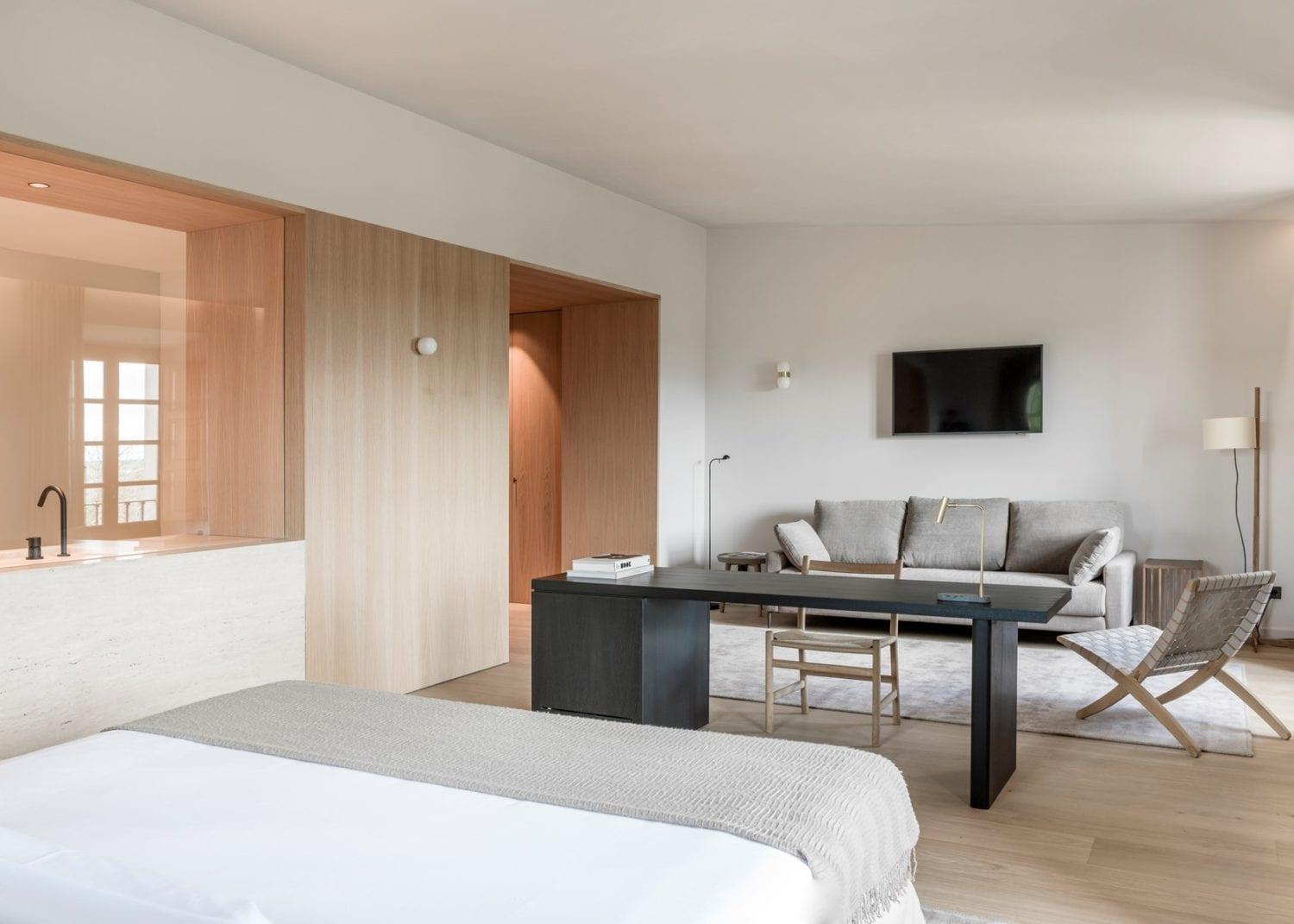 木材和石头等自然材料与酒店的其他部分保持连续性,并注重温暖的色调,从而增加了整体的好客感。现代细节,例如哑光黑色水龙头和嵌入式纹理混凝土家具,似乎从墙壁和地板上无缝地浮出水面,与具有数百年历史的砂岩拱门形成了进一步的对比。