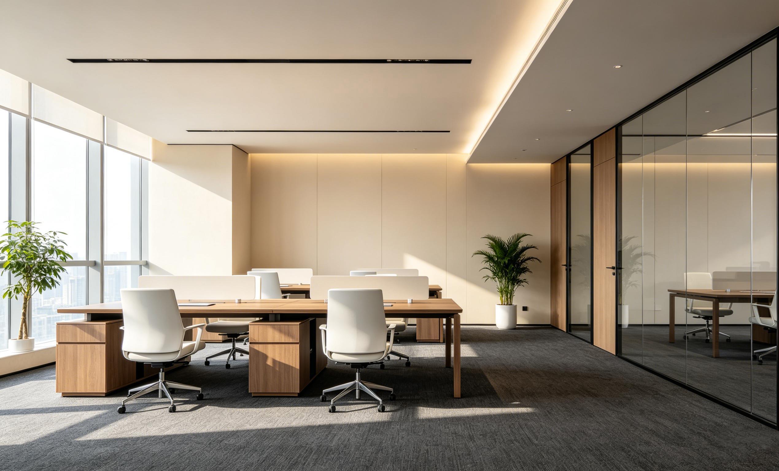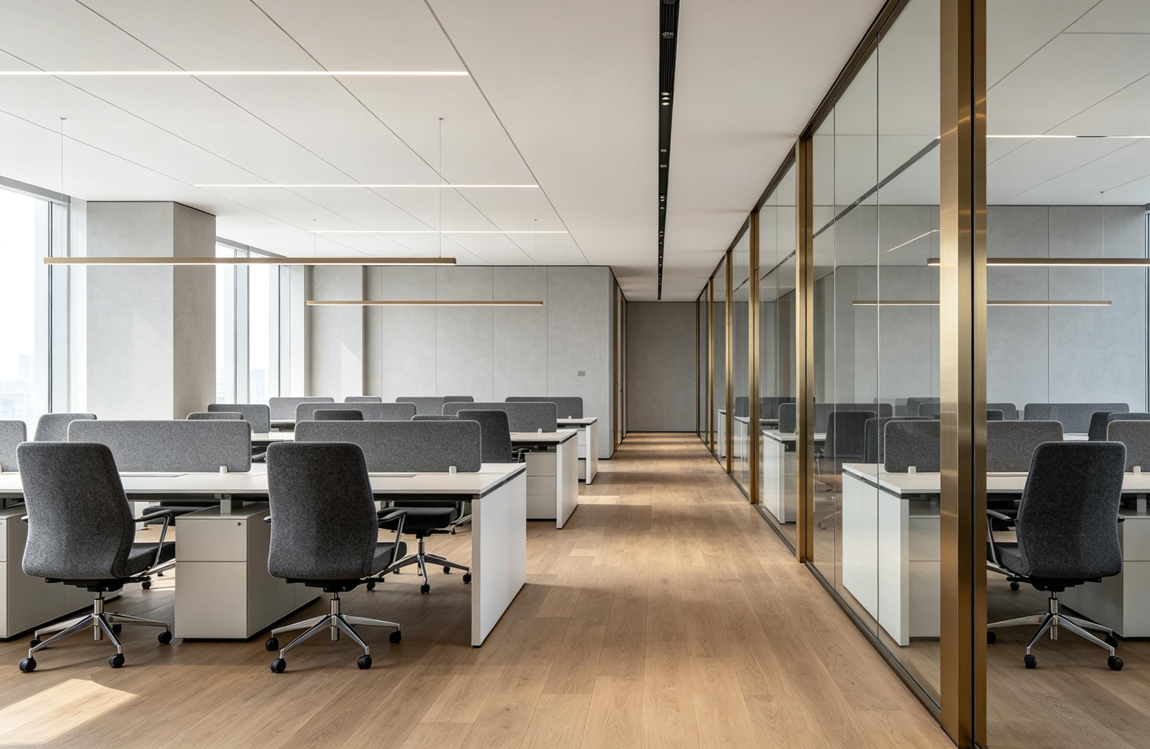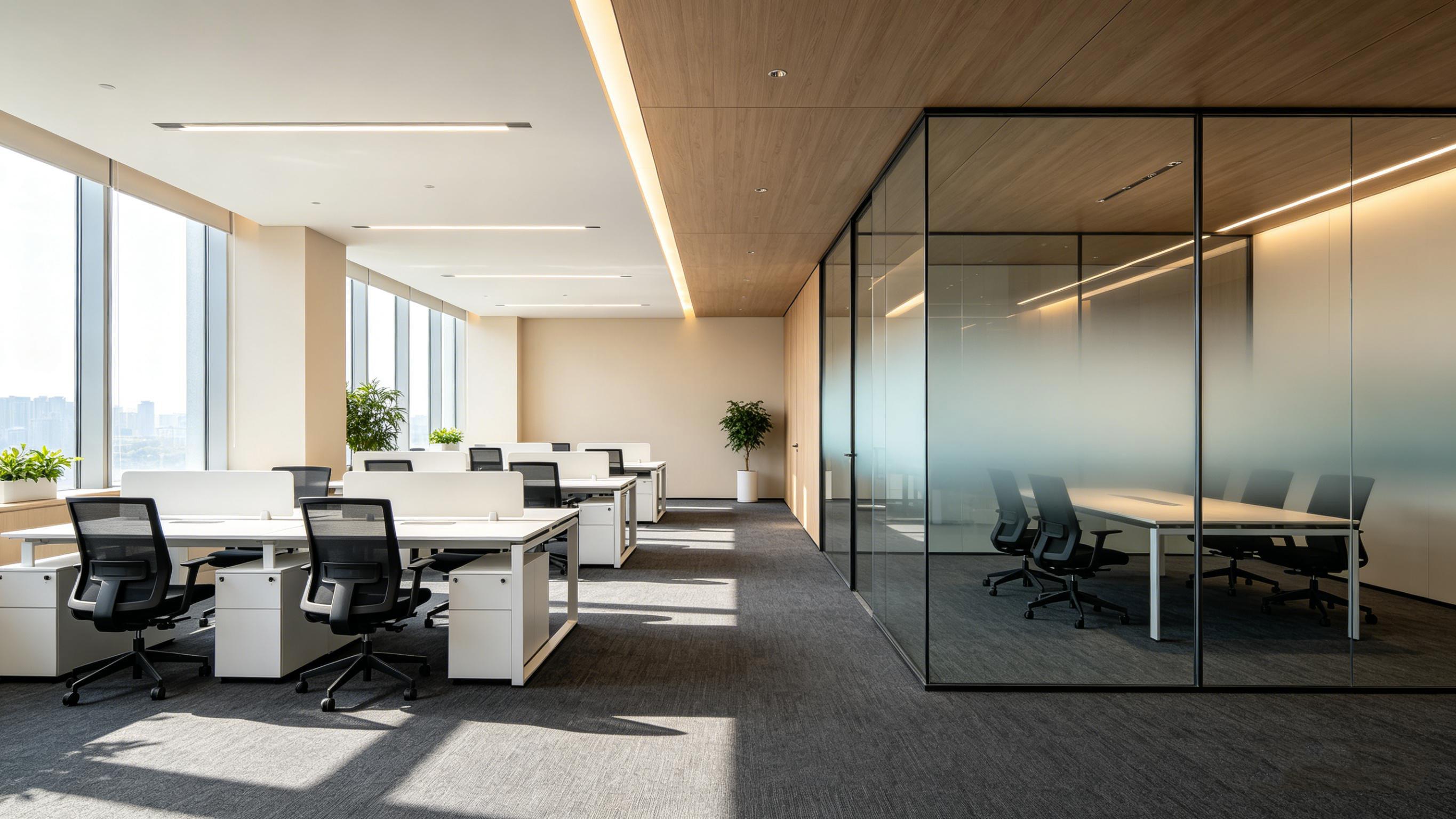 本案以低饱和的浅木色、奶白与高级黑为基底,摒弃繁杂冗余的装饰,用克制的设计语言打造出高级感满满的办公氛围。整面落地玻璃窗将城市天际线纳入视野,全景玻璃隔断划分功能区,既保证了空间的极致通透,让自然光铺满每一个工位,彻底告别压抑的小黑屋办公环境,又实现了独立办公与团队协作的平衡 —— 开放式工位满足团队高效协作,玻璃隔间则为会议、洽谈提供私密空间,通透不压抑,兼顾效率与隐私。