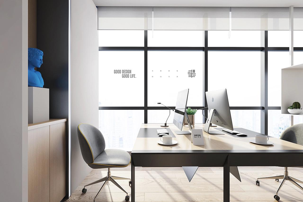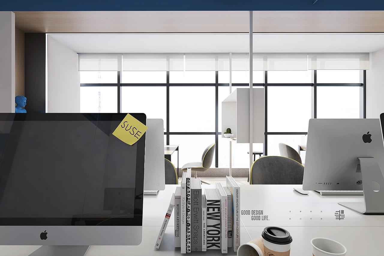 空间布局以开放式工位为核心,打破传统办公的封闭格局,最大化释放 800 平空间的通透感与动线效率。沿全景落地窗规划的核心办公区,搭配整齐排布的白色极简办公桌与苹果一体机,既满足游戏研发、策划团队的高效协作需求,又通过自然采光的最大化引入,消解长时间伏案创作的疲惫感。为兼顾私密办公与商务洽谈,空间采用玻璃隔断与半高屏风进行柔性分区,独立办公室以深色定制柜体与简约办公桌打造沉稳专业的氛围,会议室则选用白色椭圆洽谈桌与皮质座椅,兼顾项目研讨的正式感与视野开阔度,实现 “开放协作 + 私密专注” 的双重办公需求。