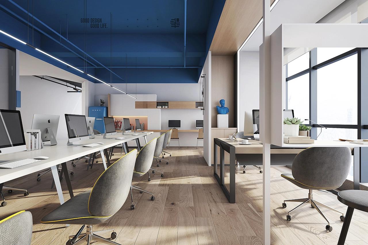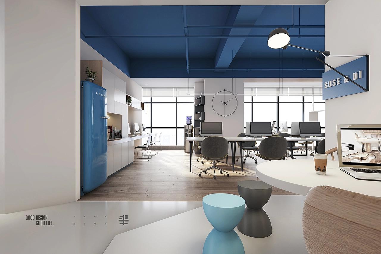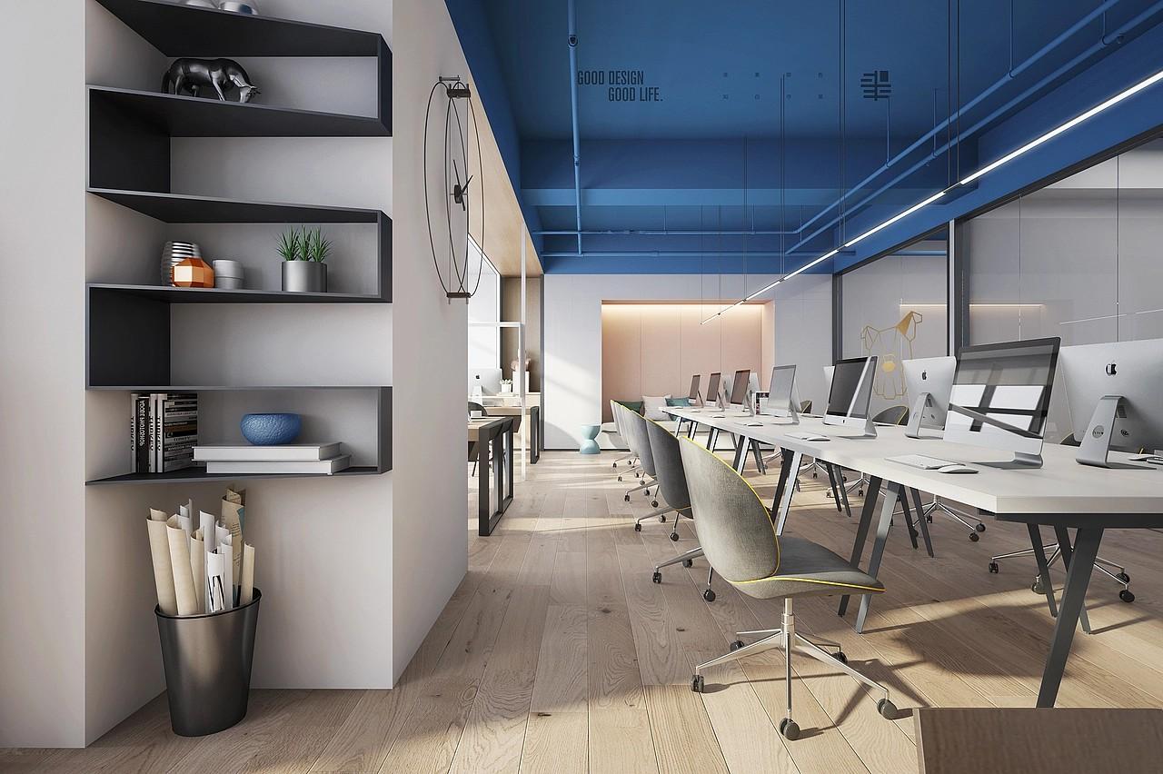 色彩与材质的搭配精准拿捏游戏行业的气质特质,以克莱因蓝为主色调,呼应游戏产业的科技感与年轻活力,同时搭配原木色地板与白色墙面,中和工业风的冷硬质感,让空间兼具温度与高级感。顶面保留蓝色管道与横梁的裸露设计,是工业风的核心表达,既降低装修成本,又通过线条层次强化空间的呼吸感,与整体蓝色主题形成视觉呼应;线性吊灯与轨道灯的组合运用,在满足基础照明的同时,通过光影变化打造层次分明的办公氛围,契合游戏团队对光影创意的审美追求。