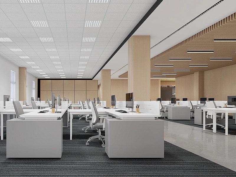 本次项目以现代简约风格为核心,围绕企业多元办公需求,对办公区、会议室、休闲水吧、健身房等全场景进行一体化设计与施工。在开放式办公区,设计师采用分层式吊顶设计,一侧以木质格栅搭配线性灯营造温暖氛围,另一侧以矿棉板吊顶保障办公采光,浅木色立柱与通透的玻璃隔断,既划分了空间,又保证了整体的开阔感,让员工在明亮通透的环境中高效协作。